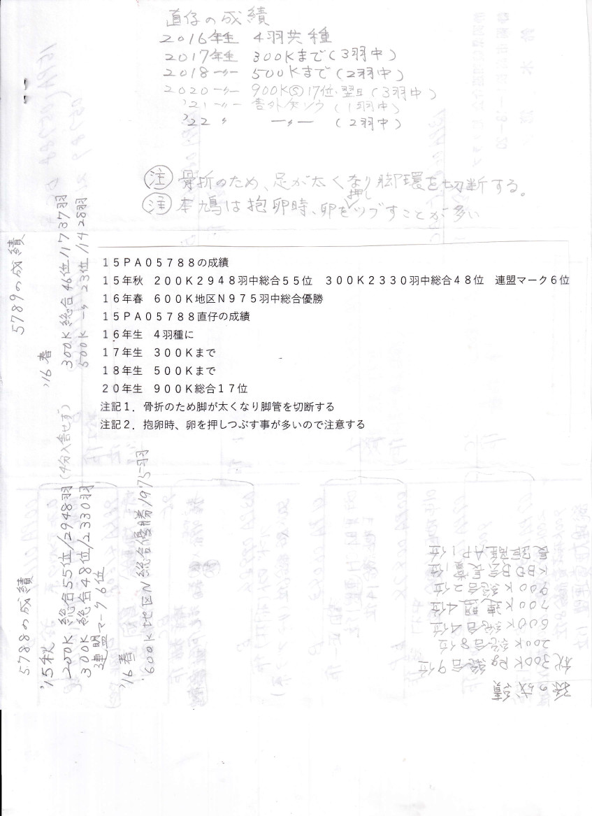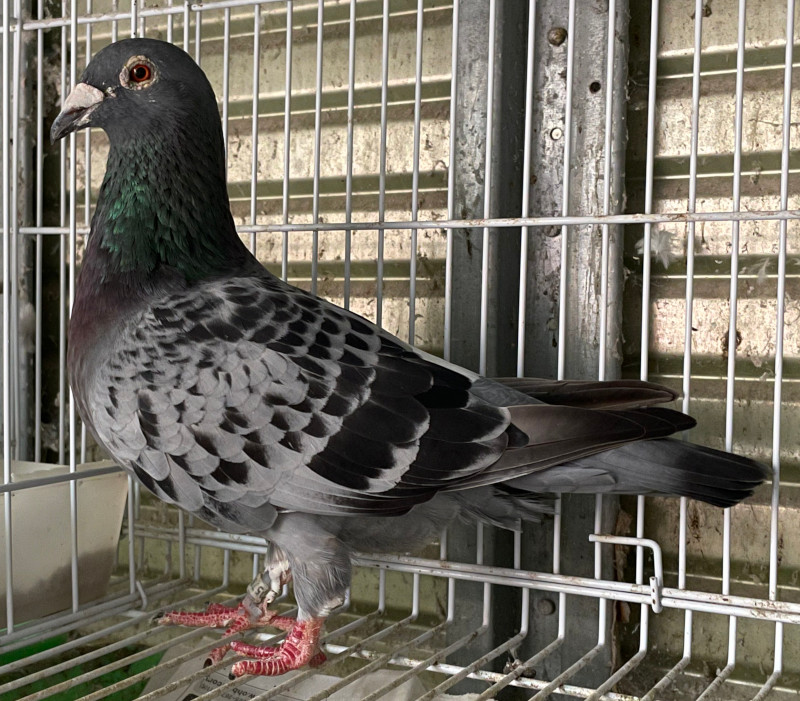出品鳩♀10番アトムクイーン号「15PA05788 BC ♀」鈴木 篤鳩舎作梅島翔地区N600K975羽中総合優勝鳩 直仔に900K桜花賞総合17位鳩 孫鳩にアトムスピードスター号桜花賞総合2位連盟会長賞&連盟長距離AP賞1位鳩がいる (ファンデンバルク&カスパーヤンセン系×ヤンセン&×リーンブーア系)直仔×(東日本CH連盟1位直仔×桜花賞総合8位総理大臣賞連盟1位娘)娘鳩 との直仔です。 父親 「13PA08463 B」鈴木篤鳩舎作 200k優勝総合11位(ファンデンバルク系×鳥飼作カスパーヤンセン系)直仔×(棒葉作赤屋ド・019系×リーンブーア系500KRG総合6位)娘鳩 との直仔です。 母親13PA06875BC鈴木篤鳩舎作(中村・窪田共作東日本CH1100K連盟1位×中村作地区N総合2位)直仔×八木作(900k鳩×地区N総合20位900K桜花賞総合8位総理大臣賞連盟1位)娘鳩 との直仔です。 詳しくは、添付の血統書の参照をお願いいたします。 ※当該鳩は骨折のため脚が太くなり脚管を切断して残骸が装着されています。その為に抱卵時に卵を押しつぶすことが多いので大き目な疑卵を入れておくとつぶす可能性が少なくなります。 <備考> 現在管理人の鳩舎で元気に過ごしています。写真は9/13日に撮影しました。 菅原明鳩舎の概要はこちらをご覧ください |