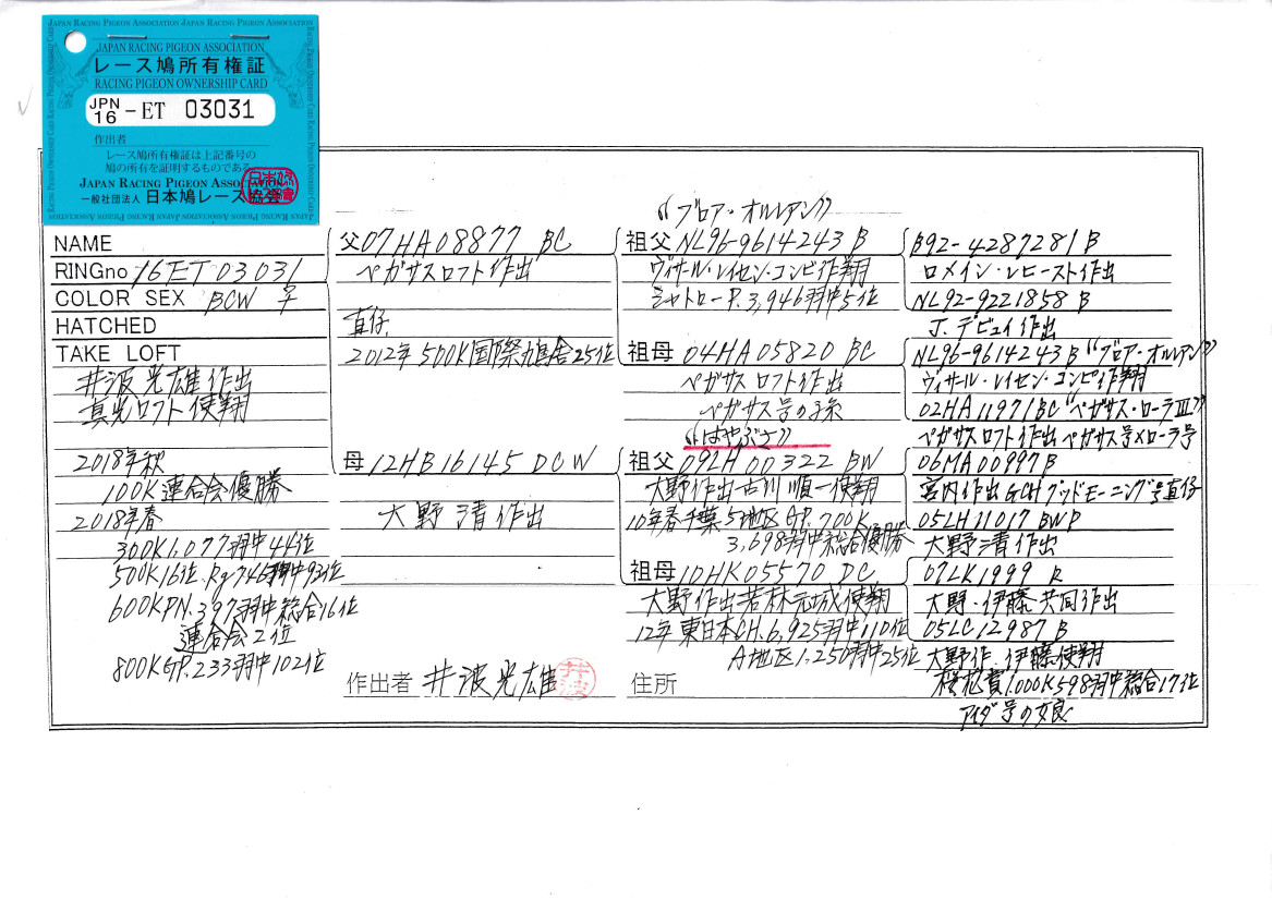 出品鳩「16ET03031 BCW ♀」井波光雄鳩舎作翔 地区N600k397羽総合16位GP800K233羽102位鳩で ペガサスロフト作ブロアオルレアン号シャトローP3946羽5位直仔×大野作ハヤブサ号千葉5地区GP700K3698羽総合優勝の娘鳩 との直仔です。 父親 「07HA08877 BC」ペガサスロフト作 直仔に12年国際鳩舎500k25位入賞している ブロアオルレアン号シャトローP3946羽5位鳩×ブロア号(ペガサス号孫鳩) との直仔です。 母親 「12HB16145 DCW」大野 清鳩舎作 ハヤブサ号千葉5地区GP700K3698羽総合優勝 × 若林翔東日本CH6925羽総合110位A地区1250羽25位鳩 との直仔です。 詳しくは、添付の血統書を参照してください。 <備考> 現在管理人の鳩舎で元気に暮らしています。写真10/16日に撮影しました。 菅原明鳩舎の概要はこちらをご覧ください |