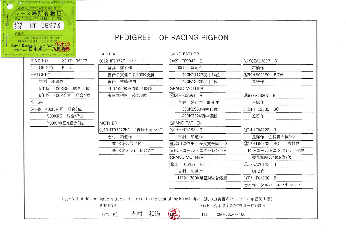 出品鳩♀40番「23HT06273 B ♀」吉村和道鳩舎作翔R5年秋RG400K総合10位 R6年春400k総合4位鳩で全兄弟も400K総合3位地区N総合3位鳩がいる 釜井作東日本GN総合9位の父親×吉峰セカンド号 との直仔です。 父親 「12HF13777 シャーリー」釜井盛司鳩舎作 直仔に吉峰稚内号東日本GN1000K総合9位鳩 伊賀国際200k優勝鳩 700k地区N総合3位鳩がいる 400k12220羽2位11127羽14位×400k2260羽優勝鳩 との直仔です。 母親 ♀15番"吉峰セカンド号"「19HT03222 BC ♀」吉村和道鳩舎作翔300K2位RG350K総合2位鳩で 直仔にRG400K総合10位400k総合3位4位地区N総合3位鳩がいる (H27年会長賞全国優勝鳩×吉峰ゴールドエクセレント号RCH&ゴールドエクセレントP認定鳩)直仔×吉峰長万部17号地区N700K総合優勝鳩との直仔です。 詳しくは、添付の血統書の参照をお願いいたします。 <備考> 現在管理人の鳩舎で元気に過ごしています。写真は1/15日に撮影しました。 菅原明鳩舎の概要はこちらをご覧ください |