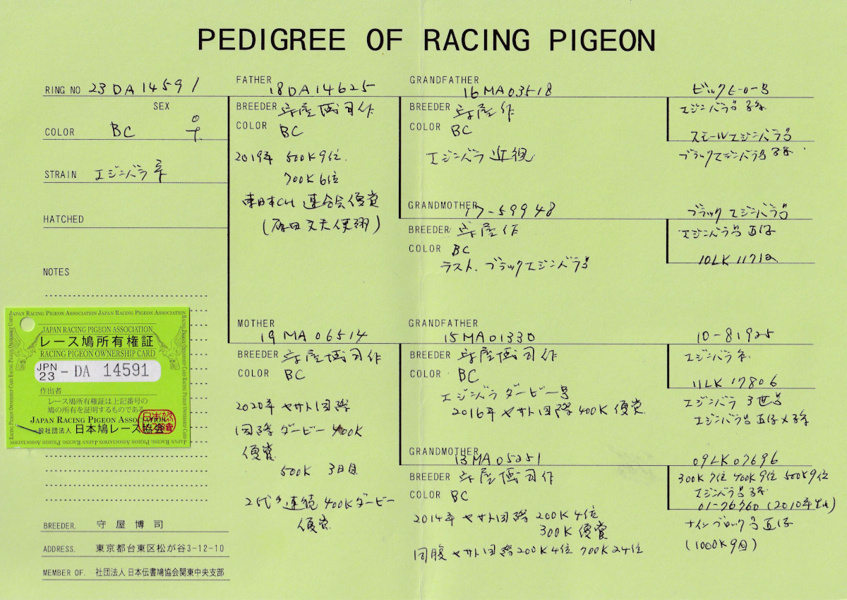| 出品鳩「23DA14591 BC♀」守屋博司作 エジンバラ系東日本CH1000K連合会優勝鳩×20年八郷国際ダービー400K全国優勝鳩 | オークションNo: 1758326924 |