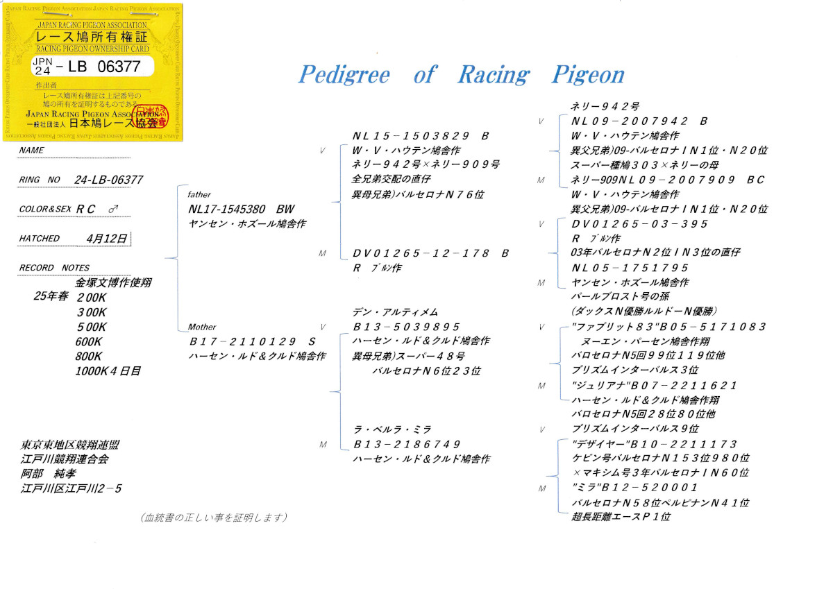 出品鳩♂24番「24LB06377 RC ♂」金塚文博鳩舎作翔25年200K300K500K600KGP800K東日本CH1000K4日目鳩です。 異父兄弟に ♀23番800KGP744羽中総合120位1000K桜花賞241羽中総合48位鳩 異母兄弟に ♀22番東日本CH1000K4日目鳩がいる ヤンセン・ホズール作バルセロナネリー号近親鳩×スーパー48号異母兄弟の娘鳩 との直仔です。 父親 「NL17−1545380 BW」ヤンセンホズール鳩舎作 ハウテン作異母兄弟バルセロナN76位(09年バルセロナIN1位異父兄弟全兄弟掛け)×ブルン作 03年バルセロナN2位IN3位の孫鳩 との直仔です。 母親 「B17−2110129 S」ハーセンルド&クルド鳩舎作 スーパー48号バルセロナN6位23位(プリズム3位×9位)異母兄弟×ミラー号バルセロナN58位ペルピナンN41位の娘鳩 との直仔です。 詳しくは、血統書を参照してください。 <備考> 現在管理人の鳩舎で元気に過ごしています。写真は9/18日に撮影しました。 菅原明鳩舎の概要はこちらをご覧ください |