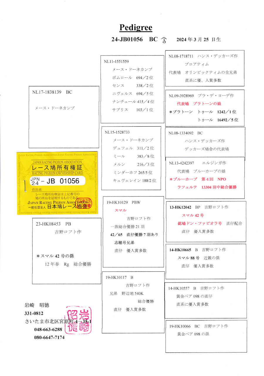 出品鳩「24JB01056 BC ♂」岩崎昭徳鳩舎作 ドーネカンプ作(ポムロール694羽2位センス338羽2位サプリスカ103羽優勝×デュフェル311羽2位メルン216羽3位ミール383羽8位)直仔×兄弟7羽優勝の一族総合優勝22羽のキイチスマル系鳩 との直仔です。 父親 「NL17−1838139 BC」メース・ドーネカンプ鳩舎作 ポムロール694羽2位センス338羽2位サプリスカ103羽優勝(オリンピックティム号全兄弟×プラトーン号トゥール1242羽優勝16492羽5位の娘)×デュフェル311羽2位メルン216羽3位ミール383羽8位(デッカーズ代表鳩×ブルーホープ号ラフェルテNPO13304羽総合優勝の娘)鳩 との直仔です。 母親 「23HK08453 PB」吉野ロフト作翔 一族総合優勝22羽のキイチスマル系 兄弟7羽優勝(スマル42号×スマル88号近親孫鳩)直仔 × 野辺地540k総合優勝の兄弟(黄金ペァー098号直仔×098号孫)娘鳩 との直仔です。 詳しくは、血統書を参照してください。 <備考> 現在管理人の鳩舎で元気に暮らしています。写真9/26日に撮影しました。 菅原明鳩舎の概要はこちらをご覧ください |