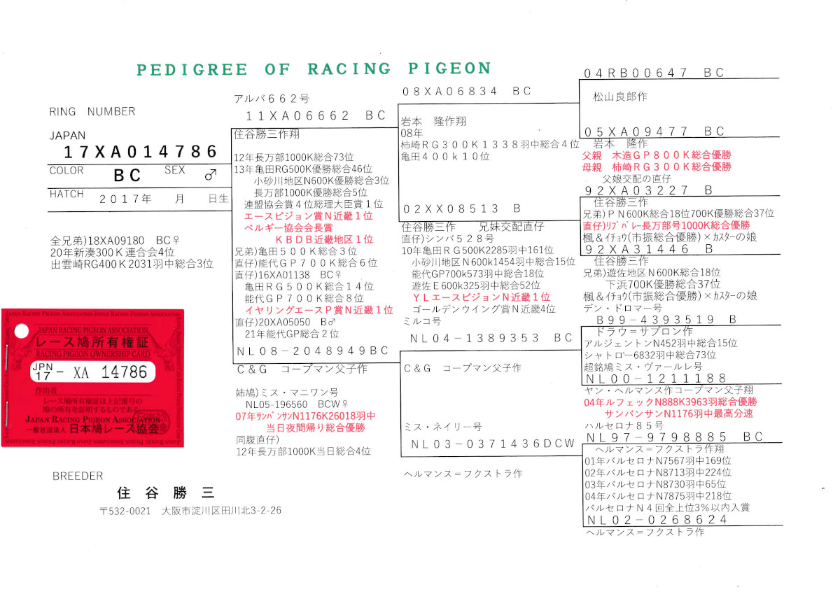 出品鳩 ♂42番「17XA14786 BC ♂」住谷勝三鳩舎作 全兄弟に 20年300k4位出雲崎RG2031羽中総合3位 半兄弟に GP総合6位8位8位桜花賞総合10位AP連盟2位がいる アルバ662号総理大臣賞連盟1位KBDB会長近畿地区1位 ×コープマン作ミス・マニワン号(サンバンサンN26018羽総合優勝)全兄弟鳩 との直仔です。 父親 ”アルバ662号”「11XA06662 BC」 住谷勝三鳩舎作翔 13年RTG500K総合73位地区N600K総合3位 桜花賞1000K総合5位 連盟会長賞4位総理大臣賞1位エースP1位 KBDB会長賞近畿地区1位獲得鳩です。 母親 「NL08−2048949 BC」C&G コープマン父子鳩舎作 ミス・マニワン号07年サンパンサンN1176K26018羽中当日夜間帰り総合優勝鳩の全兄弟鳩です。 詳しくは、添付の血統書を参照してください。 <備考> 現在管理人の鳩舎で元気に過ごしています。写真は10/7日に撮影しました。 菅原明鳩舎の概要はこちらをご覧ください |