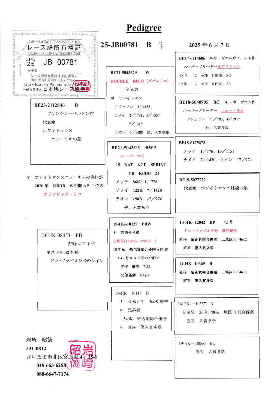出品鳩「25JB00781 B」岩崎昭徳鳩舎作ヴランケンーベルデン作 (ダブルリコ号&オリンピック・リコ号KBDB短距離AP1位の全兄弟×スーパーマリ号KBDB一歳スプリントNatAP15位)直仔×兄弟7羽優勝の一族総合優勝22羽のキイチスマル系鳩 との直仔です。 父親 「B23−2112846 B」ヴランケンーベルデン鳩舎作 ダブルリコ号(オリンピック・リコ号KBDB短距離AP1位の全兄弟)×スーパーマリ号21年KBDB一歳スプリントNatAP15位鳩 との直仔です。 母親 「23HK08453 PB」吉野ロフト作翔 一族総合優勝22羽のキイチスマル系 兄弟7羽優勝(スマル42号×スマル88号近親孫鳩)直仔 × 野辺地540k総合優勝の兄弟(黄金ペァー098号直仔×098号孫)娘鳩 との直仔です。 詳しくは、血統書を参照してください。 <備考> 現在管理人の鳩舎で元気に暮らしています。写真10/10日に撮影しました。 菅原明鳩舎の概要はこちらをご覧ください |