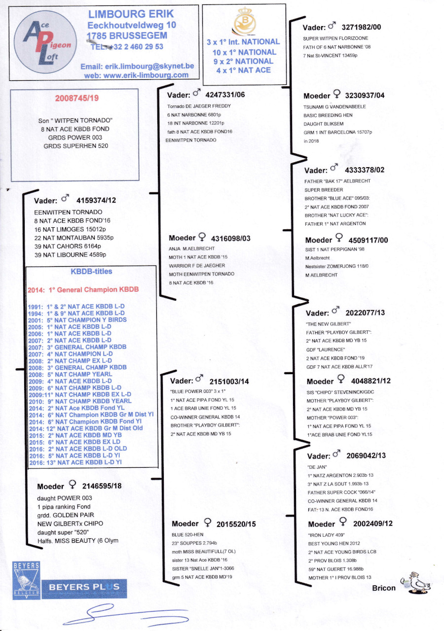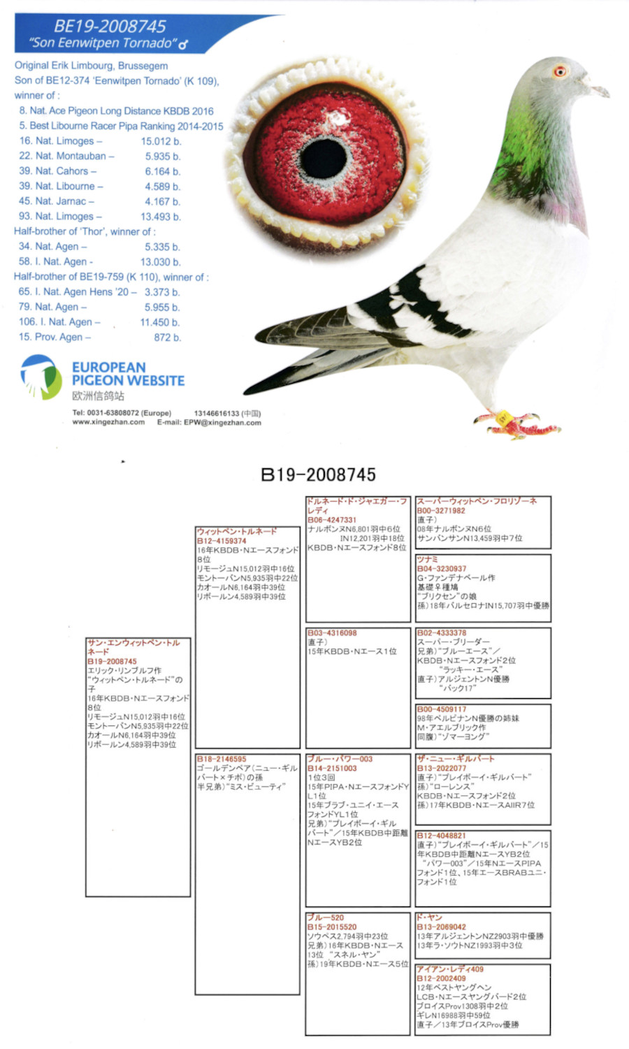出品鳩"サン・エンウットペン・トルネード号"「B19−2008745 B ♂」エリック・リンブルク鳩舎作ウィットペン・トルネード号16年KBDB・Nエースファンド8位 リモージュn15012羽16位モントバーンN5935羽22位カオールn6164羽39位鳩の直仔です。 父親 ”ウィットペン・トルネード号”「B12−4159374」16年KBDB・Nエースフォンド8位 リモージュn15012羽16位モントバーンN5935羽22位カオールn6164羽39位鳩で トルネード・ドジャエガーフレディ号ナルボンヌn69801羽6位KBDB・Nエースファンド8位×15年KBDB・NエースP1位の母親鳩 との直仔です。 母親 「B18−2146595」半兄弟にミス・ビュ−ティ号がいる ブパワー003号優勝3回15年PIPA・NエースファンドYL1位(全兄弟プレイボーイギルバード号KBDB中距離N一歳AP2位)×ブルー520号ソウペス2794羽23位(ド・ヤン号アルジェントンNZ2903羽優勝×アイアンレディ409号ギレN16988羽59位鳩 との直仔です。 詳しくは、血統書を参照してください。 <備考> 現在管理人の鳩舎で元気に暮らしています。写真10/17日に撮影しました。 菅原明鳩舎の概要はこちらをご覧ください |