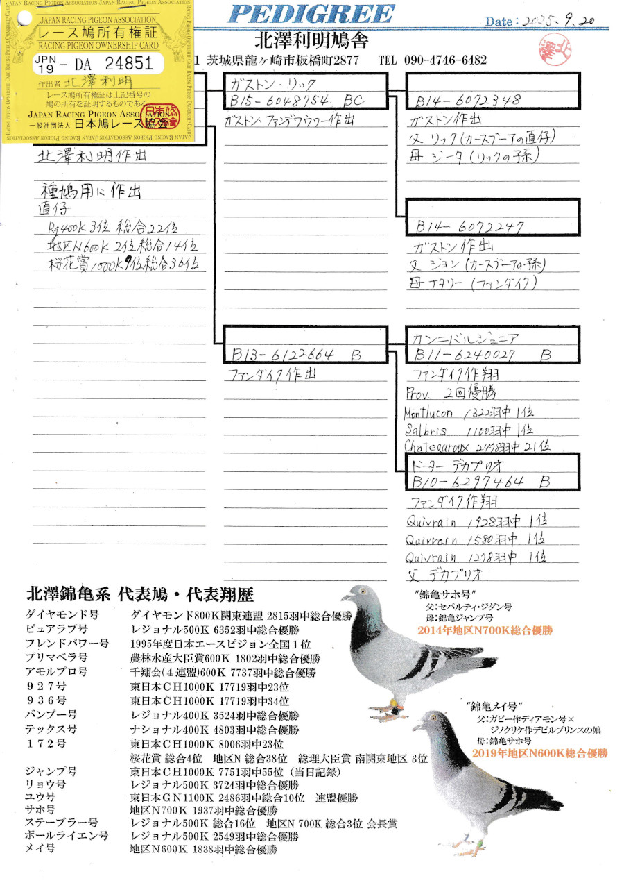 出品鳩「19DA24851 BC♀」北澤作直仔)RG総合22位PN総合14位桜花賞総合36位 ガストンリック号×(カンニバルジュニア号P×ドーターデカプリオ号) ![]() |