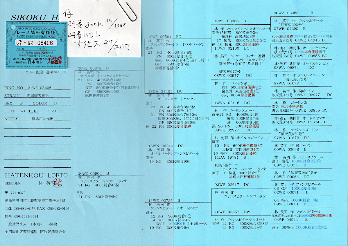出品鳩「21WZ08406 B ♂」林 英司鳩舎作 四国破天荒系 直仔に 八郷サクセス2117羽27位鳩300k1008羽14位鳩がいる PN総合10位桜花賞総合4位GP総合6位総理大臣賞連盟2位鳩×RG400K総合46位鳩 との直仔です。 父親 「20WZ05878 BC」林 英司鳩舎作翔 四国破天荒系(オペルゴートンファンスピタール系) 21年RG400K総合74位PN600K総合10位桜花賞800K総合4位GP650K総合6位 総理大臣賞連盟2位鳩です。 母親 「20WZ05906 B」林 英司鳩舎作翔 四国破天荒系(ファンスピタール×オートウィナー系) 21年RG400K総合46位鳩で 兄弟も21年PN600K総合6位入賞鳩がいます。 詳しくは、血統書を参照してください。 <備考> 現在管理人の鳩舎で元気に暮らしています。写真10/17日に撮影しました。 菅原明鳩舎の概要はこちらをご覧ください |