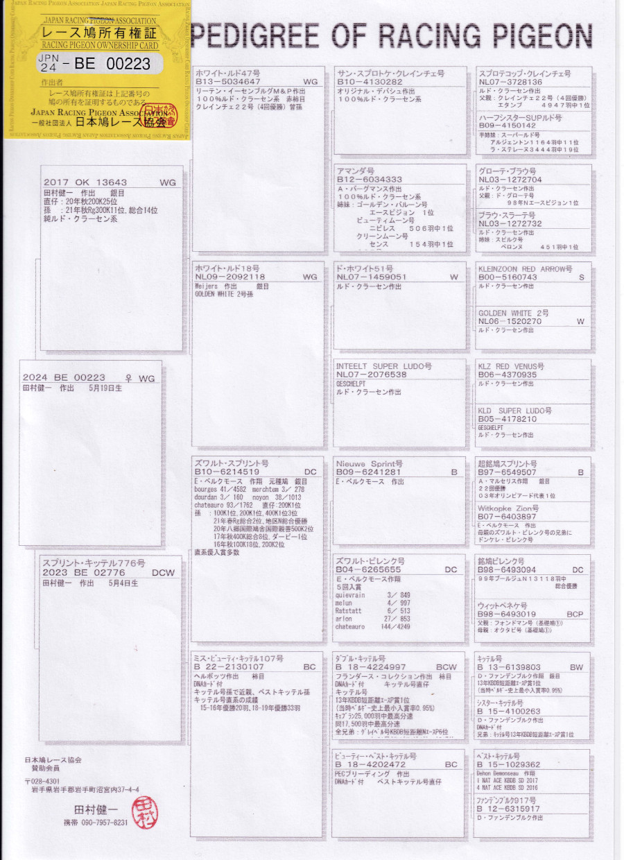 出品鳩「24OK00223 WG ♀」田村健一鳩舎作 純ルド・クラーセン系(ホワイト・ルド47号×ホワイト・ルド18号) 直仔 ×スプリント・キッテル776号(ズワルト・スプリント号)ブルージュ4582羽41位×ミス・ビュティキッテル107号)との直仔です。 父親 「17OK13643 WG」田村健一鳩舎作 孫鳩にRG300K総合14位鳩がいる 純ルド・クラーセン系 ホワイト・ルド47号(クレインチェ22号4回優勝の曾孫)×ホワイト・ルド18号(両親ルド・クラーセン作) との直仔です。 母親 ”スプリント・キッテル776号”「23BE02776 DCW」田村健一鳩舎作 スワルト・スプリント号(スプリント号孫鳩)ブルージュ4582羽41位×ヘルボッツ作ミス・ビュティキッテル107号(キッテル号直仔×ベストキッテル号娘)娘鳩 との直仔です。 詳しくは、添付の血統書を参照してください。 <備考> 現在管理人の鳩舎で元気に過ごしています。写真は10/17日に撮影しました。 菅原明鳩舎の概要はこちらをご覧ください |