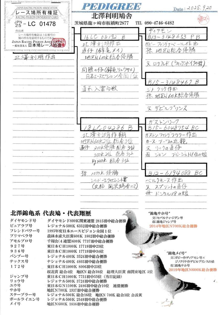 出品鳩 「25LC01478 B」北澤利明作異父兄弟)錦亀メイ号地区N総合優勝(ディアモン号カビー作×デビルプリンス号の娘)×地区N600K総合3位 ![]() |
