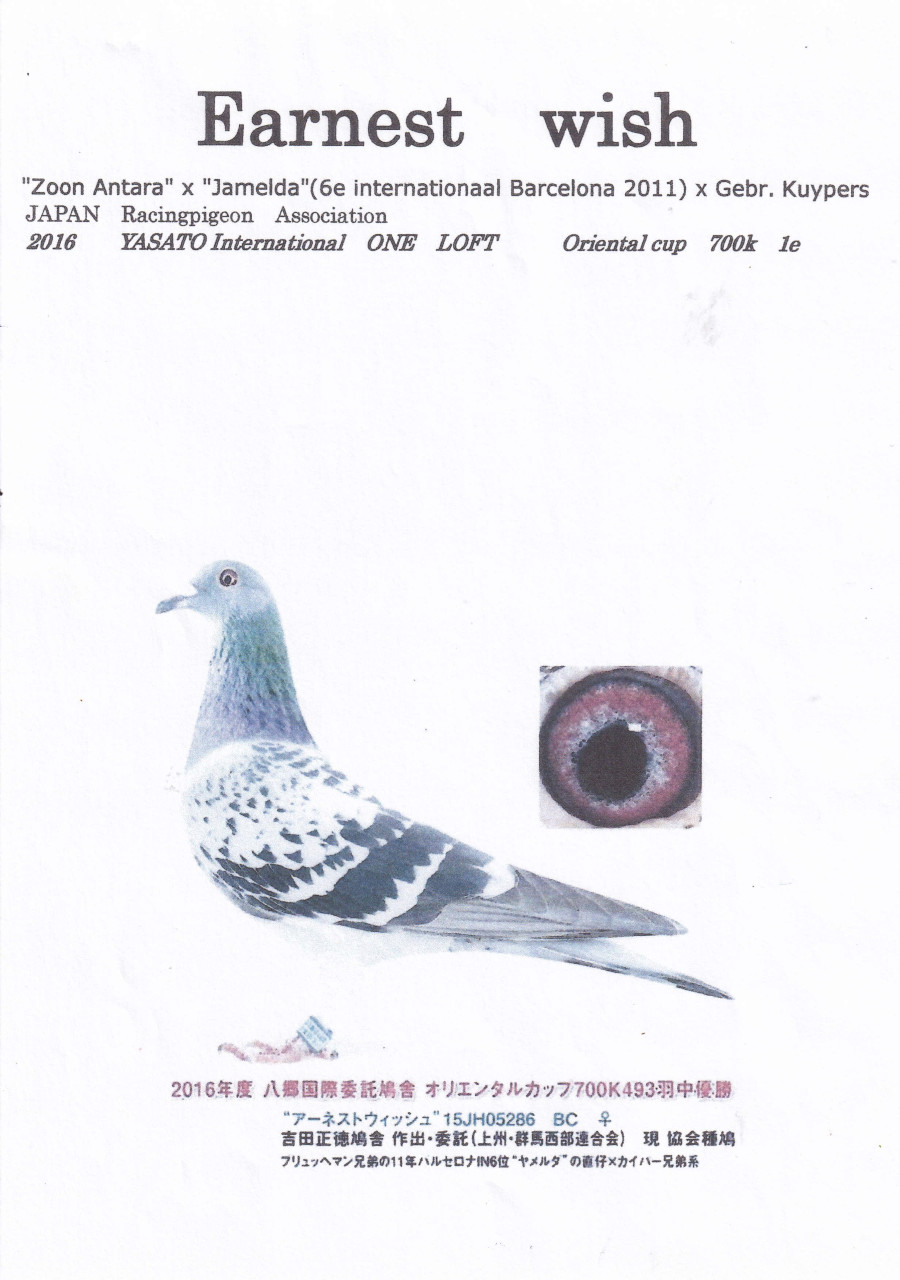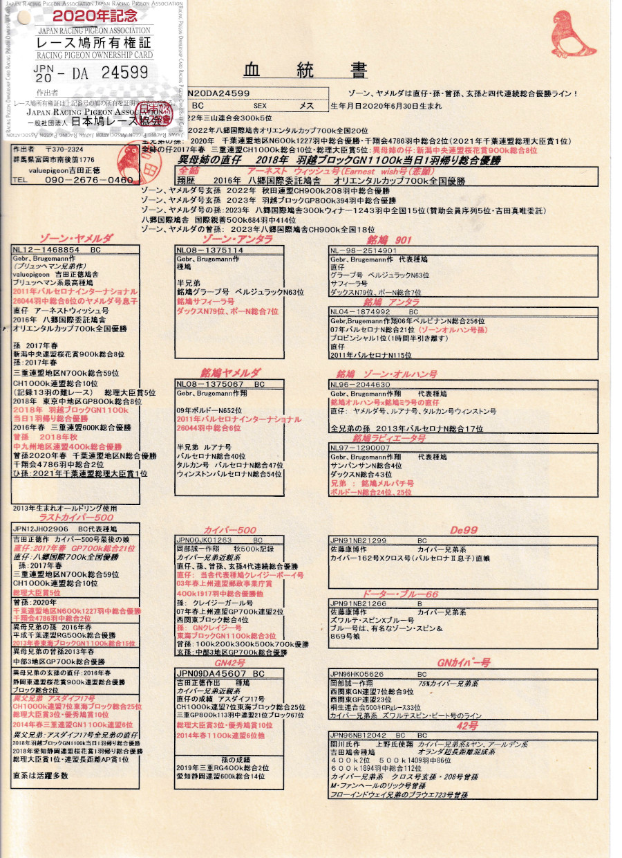 出品鳩「20DA24599 BC♀」吉田正徳作兄弟)八郷国際オリエンタルカップ700K全国優勝 ゾーンヤメルダ号(銘鳩ヤメルダ号バルセロナIN総合6位直仔)直仔 ![]() |