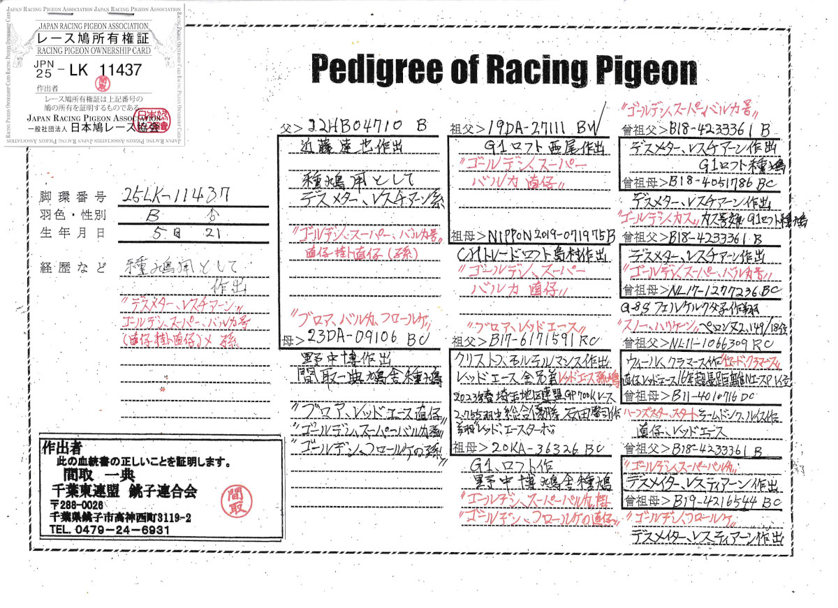 出品鳩「25LK11437 B」間取一典作デズメータ作ゴールデンスーパーバルカ近親孫×レッドエース号超長距離NエースP1位実弟×ゴールデンスーパーバルカの娘) ![]() |