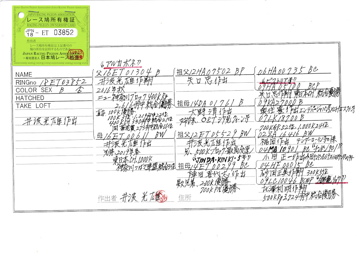 出品鳩「18ET03852 B♂」井波光雄作アネカポネ号ニュー神奈川ブロック400K2616羽総合優勝×19年東日本CH1000K連盟3位の兄弟 ![]() |
