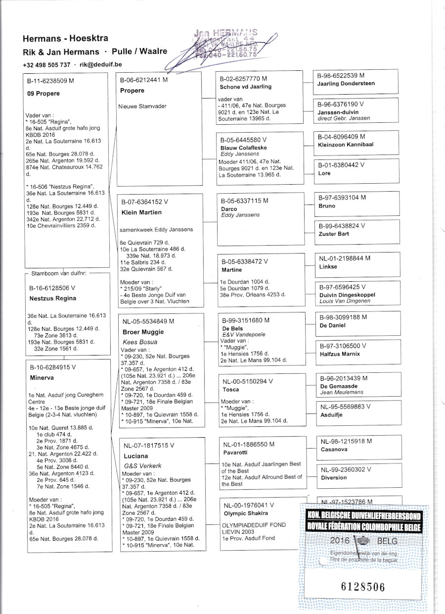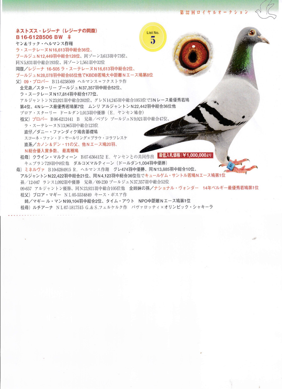 出品鳩"ネクトズス・レジーナ号"「B16−6128506 BW ♀」ヤン&リック・ヘルマンス鳩舎作翔 ラ・ステレーヌN16613羽総合36位ブールジュN12449羽総合128位 同腹もラステレーヌN16613羽総合2位入賞している プロパー号直仔×ミネルヴァ号ゲレN総合10位アルジェントンN総合21位鳩 との直仔です。 父親 ”09プロパー号”「B11−6238509」ヘルマン・フクストラ鳩舎作 全兄弟にブールジュn17814羽総合52位鳩アルジェントンN22442羽総合47位鳩がいる 銘鳩プロパー号×ヤンセン共同作クライン・マルティーン号 との直仔です。 母親 "ミネルヴァ号"「B10−6284915」R・ヘルマンズ鳩舎作翔 ゲレN13885羽総合10位アルジェントンn22422羽総合21位4123羽総合36位キュールゲム・サルトル若鳩NエースP1位鳩で キースボスア作ブロアーマギ号×フェルケルク作オリンピックシャキーラ号の娘鳩 との直仔です。 詳しくは、血統書を参照してください。 <備考> 振込または、現金書留でお願いします。 菅原明鳩舎の概要はこちらをご覧ください |