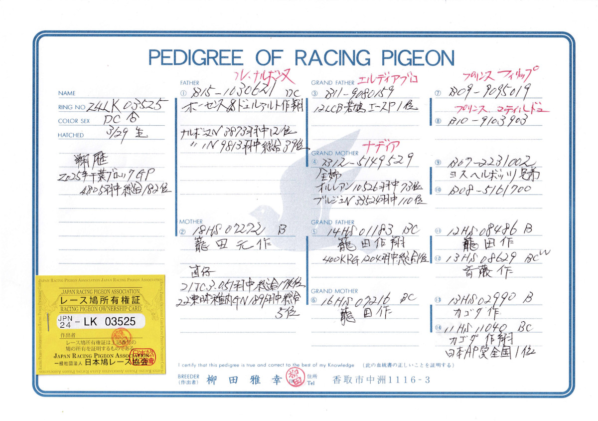 出品鳩「24LK03525 DC ♂」柳田雅幸鳩舎作翔 25年千葉ブロックGP4805羽総合182位鳩 異父兄弟に22年東日本GN1891羽総合5位鳩がいる ル・ナルボンヌ号ナルボンヌN3873羽12位IN9813羽総合39位×籠田作(RG400K1204羽総合優勝×日本AP賞全国優勝の娘)娘鳩 との直仔です。 父親 ”ル・ナルボンヌ号”「B15−1030627 DC」ホーセンス&ドュルアルト鳩舎作翔ナルボンヌN3873羽12位IN9813羽総合39位入賞鳩で エルテイ゛ィアブロ号12年LCB若鳩AP1位 ×ナディア号(全姉オルレアン10526羽73位ブールジュN33524羽110位) との直仔です。 母親 「18HS07272 B」篭田 元鳩舎作 直仔に 東日本GN総合5位 JC3051羽総合174位鳩がいる RG400K1204羽総合優勝×日本エースP賞全国1位の娘鳩 との直仔です。 詳しくは、血統書を参照してください。 <備考> 現在管理人の鳩舎で元気に暮らしています。写真10/10日に撮影しました。 菅原明鳩舎の概要はこちらをご覧ください |