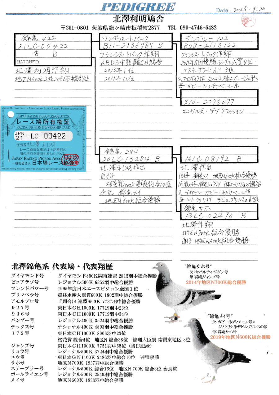 出品鳩”錦亀422号”「21LC00422 B ♂」北澤利明鳩舎作翔 地区N600K2位2056羽中総合7位 異父兄弟に桜花賞1000K優勝総合14位鳩がいる デンブルー122号5回優勝8回入賞の直仔×錦亀284号(錦亀メイ号地区N600K総合優勝の全兄弟)との直仔です。 父親 ”ワンダフメルトバック号”「B11−2136787 B」フランシス・トバック鳩舎作(KBDB中距離CH鳩舎) デンブルー122号5回優勝8回入賞鳩(ファンダイク・カンンニバル号ライン×カビー系)直仔×エンゲルス・デブクワ系鳩 との直仔です。 母親 ”錦亀284号”「20LC13284 B」北澤利明鳩舎作 直仔に桜花賞1000K優勝総合14位 実兄鳩にも 錦亀メイ号地区N600K総合優勝鳩がいる 錦亀サポ号地区N700総合優勝鳩 の直仔です。 詳しくは、血統書を参照してください。 <備考> 振込または、現金書留でお願いします。 菅原明鳩舎の概要はこちらをご覧ください |