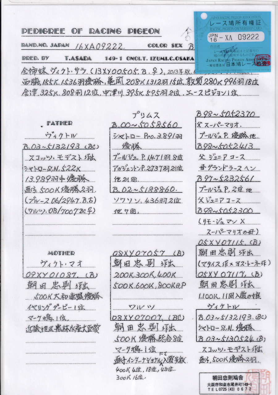 出品鳩「16XA09222 B♂」朝田忠則作全姉妹)ヴィクトサラ号150K優勝400k2位AP1位 ヴイクトル号シャトローSN13989羽優勝×ヴィクトマオ号500K総合優勝 ![]() |