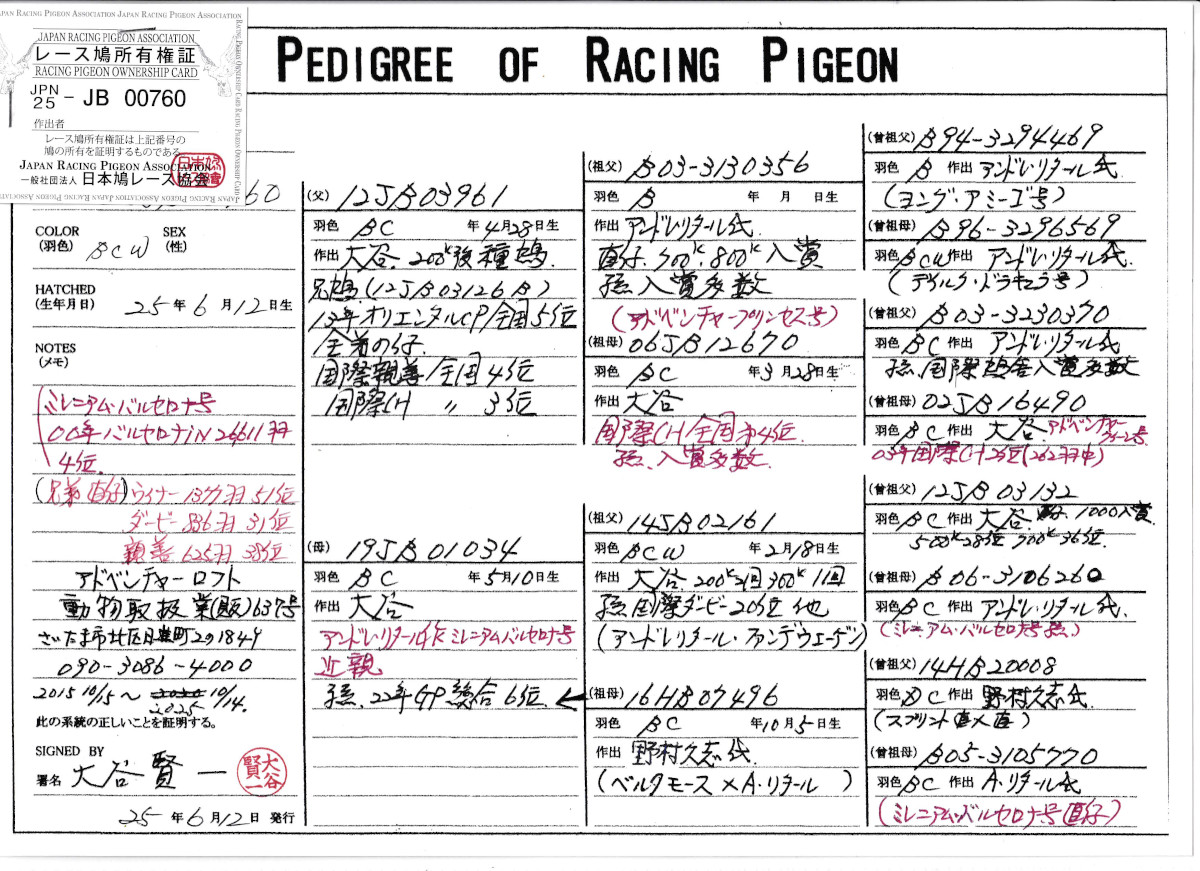 出品鳩「25JB00760 BCW」アドベンチャーL大谷賢一作オリエンタルC700K全国5位の兄弟×ミレミアム・バルセロナ号バルセロナIN4位近親鳩 ![]() |