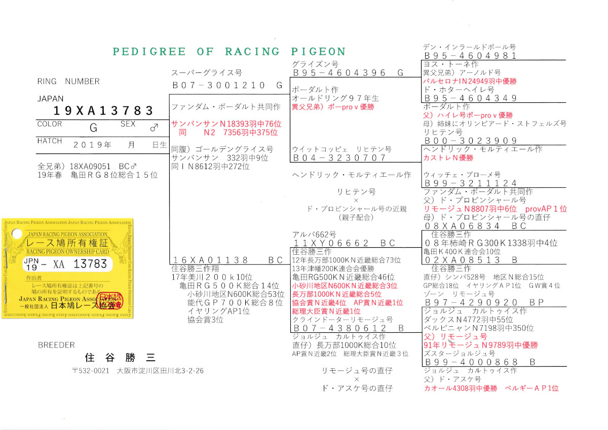 出品鳩♂69「19XA137838 G ♂」住谷勝三鳩舎作 全兄弟に19年春亀田RG500K総合15位入賞鳩がいる スーパーグライス号サンバンサンN189393羽76位同S2N7356羽375位入賞鳩×若鳩エースP1位協会賞3位鳩 との直仔です。 父親 "スーパーグライス号"「B07−3001210 G」ファンダム・ボーダルト鳩舎共同作翔 サンバンサンN189393羽76位同S2N7356羽375位入賞鳩で アーノルド号リヒテン号カストレN優勝鳩の娘鳩 との直仔です。 母親 ♀15番「16XA01138 BC ♀」住谷勝三鳩舎作翔 RG500K総合14位地区N総合53位GP総合8位一才鳩エースP1位協会賞3位鳩 直仔に亀田RG総合15位鳩 異母兄弟にGP総合6位鳩 桜花賞1000K総合10位AP連盟2位他鳩がいる アルバ662号KBDB会長近畿地区1位 ×カルトゥス作(リモージュ号孫 ×ユーロダイヤモンド号叔母)娘鳩 との直仔です。 詳しくは、添付の血統書を参照してください。 <備考> 振込または、現金書留でお願いします。 菅原明鳩舎の概要はこちらをご覧ください |
