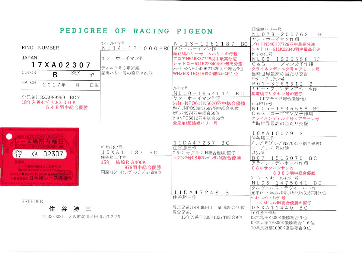 出品鳩♂33番「17XA02307 B ♂」住谷勝三鳩舎作 全兄弟鳩に18年入善IN548羽中総合優勝鳩がいる サンアレクシア号ヤン・ホーイマン作超銘鳩ハリー号近親鳩×二代連続総合優勝母親の パルサ187号柿崎RG979羽中総合優勝鳩 との直仔です。 父親 高齢鳩♂3番"サンアレクシア号"「NL14−1210006 BC」ヤン・ホーイマン鳩舎作 (超銘鳩ハリー号Xハリー号の母)直仔 X アレクシア号シャトローNPO5620羽中総合優勝鳩&超銘鳩ハリー号の妹鳩 との直仔です。 母親 ♀8番"パサラ187号"「15XA11187 BC」住谷勝三鳩舎翔 15年 柿崎RG979羽総合優勝鳩で 直仔も入善IN548羽総合優勝している 二代連続優勝鳩の母親で (ブリーブ号ブリーブN総合優勝近親直仔 X マキシマ号サンバンサンN総合優勝)直仔×(ゾーン・ペルピナンキング号×亀田IN総合9位長万部1000K総合8位)娘鳩 との直仔です。 詳しくは、添付の血統書を参照してください。 <備考> 現在管理人の鳩舎で元気に過ごしています。写真は10/20日に撮影しました。 菅原明鳩舎の概要はこちらをご覧ください |