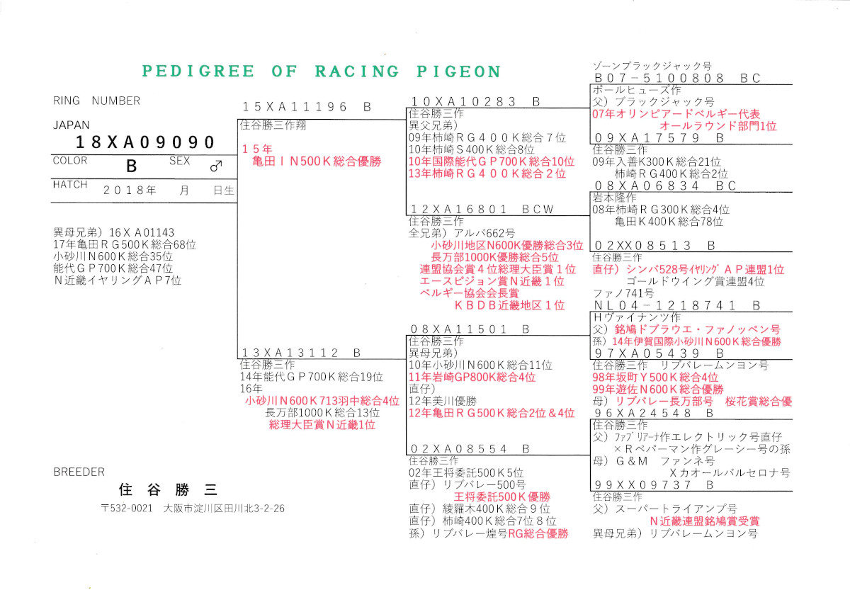 出品鳩♂49番「18XA09090 B ♂」住谷勝三鳩舎作 異母兄弟)17年亀田RG500K総合68位小砂川地区N総合35位能代GP総合47位 若鳩AP7位鳩がいる 17年秋亀田IN500K総合優勝×16年地区N総合4位桜花賞総合13位総理大臣賞連盟1位鳩 との直仔です。 父親 ♂13番「15XA11196 B ♂」住谷勝三鳩舎作翔 17年秋亀田IN500K総合優勝 直仔にN近畿イヤリングAP7位鳩がいる ゾーンブラックジャック号(ブラックジャック号オリンピアード点オールラウンド1位の直仔)×アルバ622号KBDB会長賞近畿地区1位の実妹鳩 との直仔です。 母親 「13XA13112 B」住谷勝三鳩舎作翔 14年能代GP総合19位16年地区N総合4位桜花賞総合13位総理大臣賞連盟1位鳩で (銘鳩ド・ブラウエファクノッペン号直仔×地区N600K総合優勝)直仔×リブバレー500号王将500K優勝の母親 との直仔です。 詳しくは、添付の血統書を参照してください。 <備考> 現在管理人の鳩舎で元気に過ごしています。写真は10/20日に撮影しました。 菅原明鳩舎の概要はこちらをご覧ください |