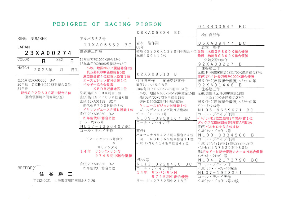 出品鳩 ♀97番「23XA00274 B ♀」住谷勝三鳩舎作 全兄弟に20年秋名立IN400K1038羽総合3位 21年能代GP700K620羽総合2位鳩 異母兄弟にも 能代GP700K総合6位総合8位鳩がいる アルバ662号総理大臣賞連盟1位KBDB会長近畿地区1位 ×コール・デハイデ作ゾーンマリアンヌ号(サンバンサンN9745羽総合優勝の娘)との直仔です。 父親 ”アルバ662号”「11XA06662 BC」 住谷勝三鳩舎作翔 13年RTG500K総合73位地区N600K総合3位 桜花賞1000K総合5位 連盟会長賞4位総理大臣賞1位エースP1位 KBDB会長賞近畿地区1位獲得鳩です。 母親 "ドーター・マリアンヌ号"「NL17−1360407 BC」コール・デハイデ鳩舎作 ゾーンドン・ミッシェル号(ドン・ミッシェル号×ペルピナン・ドゥイビン号)×マリアンヌ号サンバンサンN9745羽総合優勝鳩 との直仔です。 詳しくは、添付の血統書を参照してください。 <備考> 現在管理人の鳩舎で元気に過ごしています。写真は10/20日に撮影しました。 菅原明鳩舎の概要はこちらをご覧ください |
