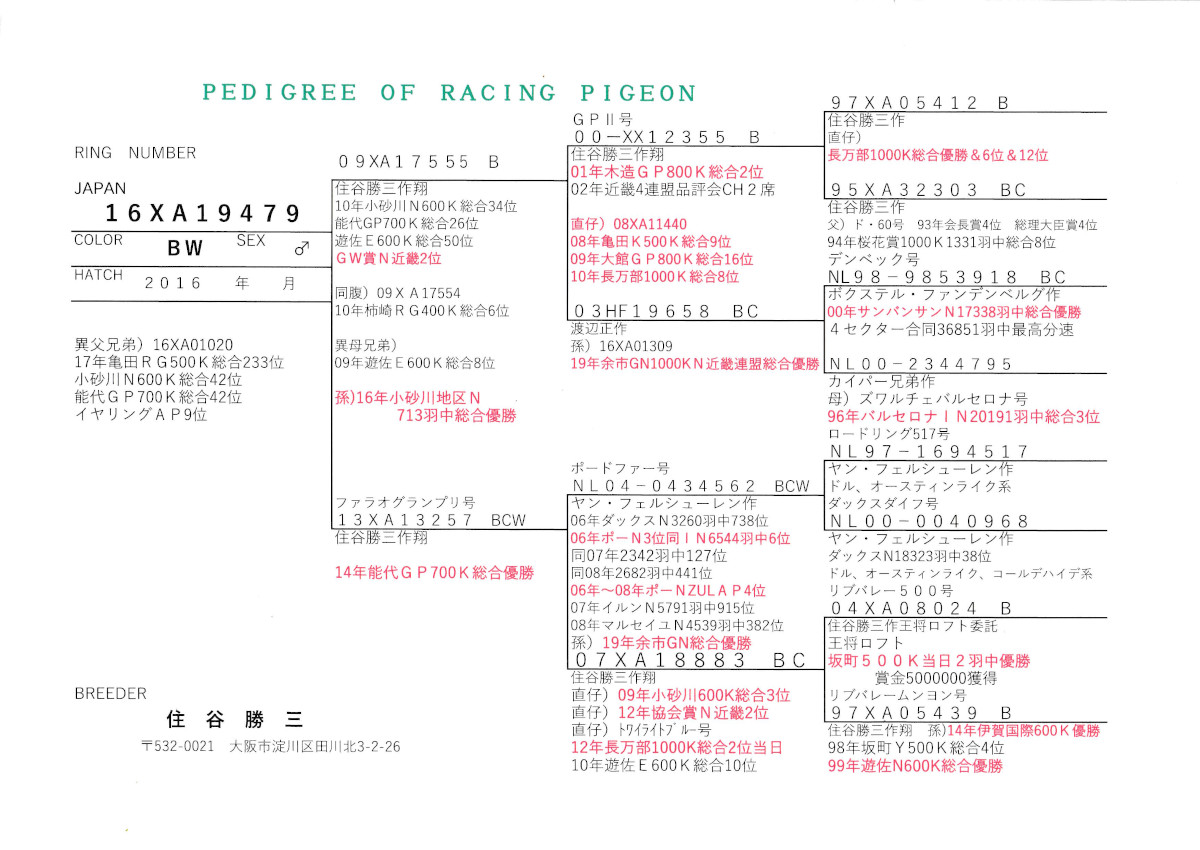 出品鳩♂31番「16XA19479 BW♂」住谷勝三作異母兄弟)地区N総合42位GP総合42位若鳩AP9位 ゴールドウイング賞連盟2位×能代GP700K総合優勝 ![]() |