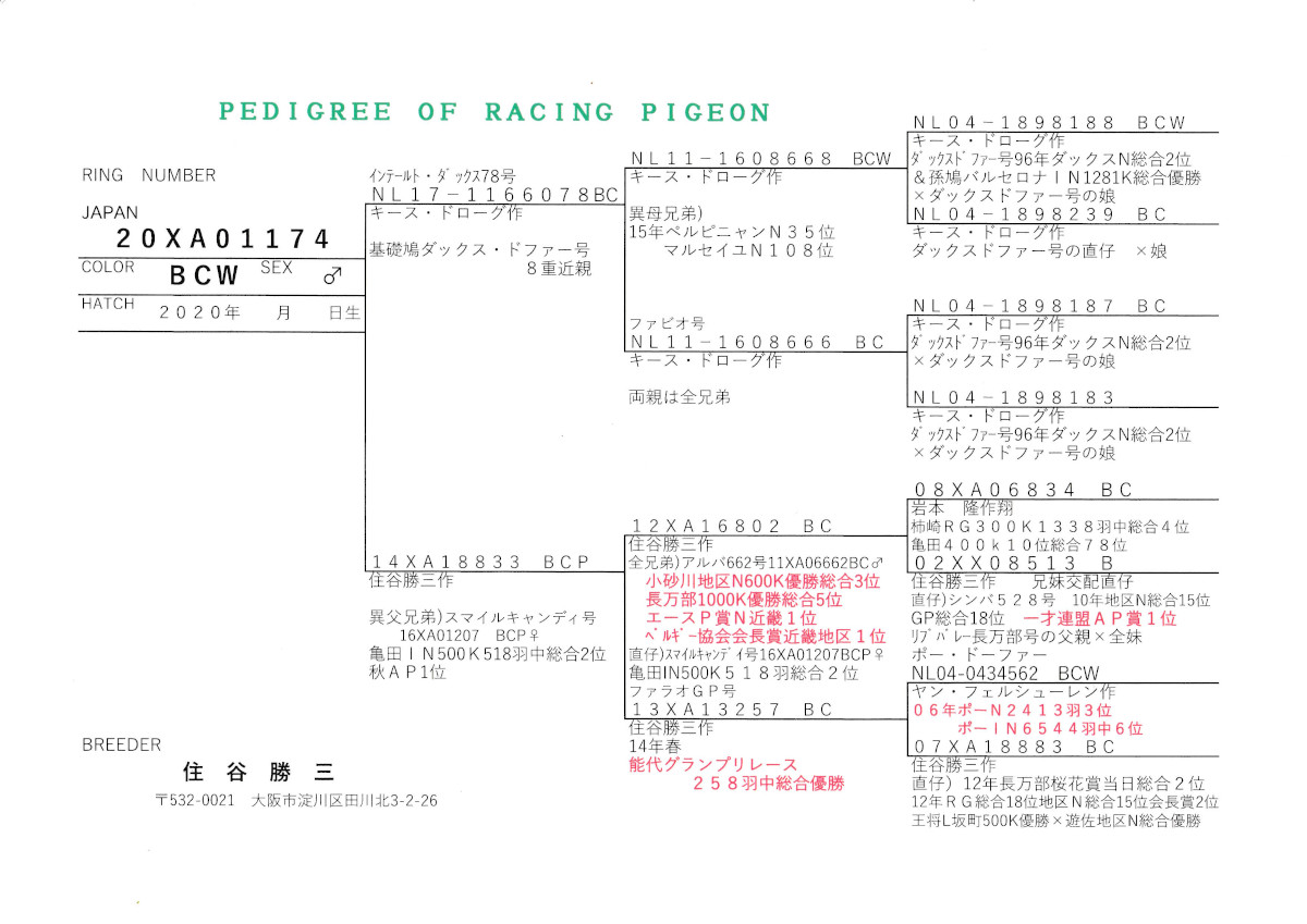 出品鳩♂73番「20XA01174 BCW♂」住谷勝三作キースドローグ作ダックスドファー号8重近親×(アルバ662号全兄弟×ファラオGP号能代GP総合優勝) ![]() |