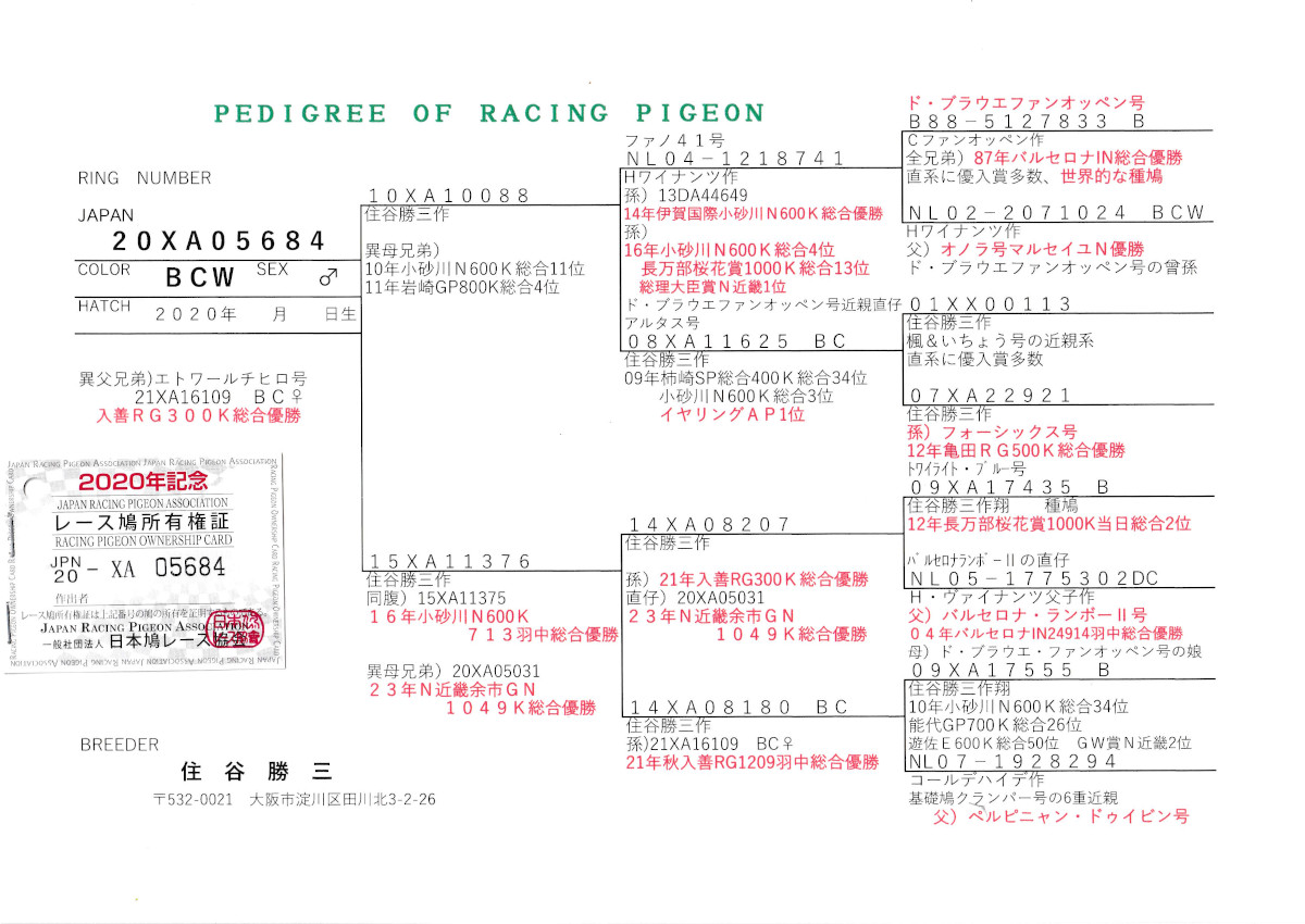 出品鳩♂82番「20XA05684 BCW♂」住谷勝三作半兄弟)入善RG総合優勝(ドブラウエファンオッペン号直仔×アルタス号PN総合3位)×23年余市GN総合優勝半兄弟 ![]() |