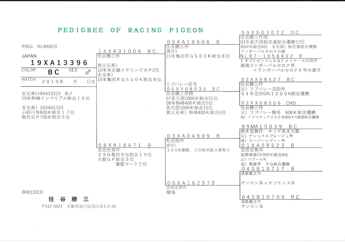 出品鳩♂62番「19XA13396 BC♂」住谷勝三作 全兄弟)小砂川N総合17位能代GP700K総合5位鳩柿崎IN400K総合10位鳩 リブバレー匠号直仔×大館GP総合3位 ![]() |