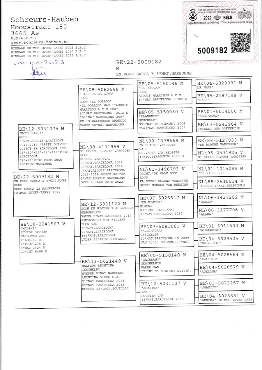 出品鳩「B22−5009182 RC ♂」シュルールス・ハウベン鳩舎作 ロードハルカ号19年バルセロナN5年間エースP2位・プリズムインターパルス2位×ナルボンヌN5位入賞鳩 との直仔です。 父親 ”ロードバルカ号”「B12−5031075 RC」シュルールス・ハウベン鳩舎作翔2015〜2019年5年間バルセロナNエースP2位・プリズムインターパルス2位鳩で エメラルド号直仔×ワイナンツ作ブラウエ・ファンオッペン号孫鳩 との直仔です。 母親 "マディナ号"「B16−2241563」シュルールス・ハウベン鳩舎作翔 17年ナルボンヌN3424羽中5位IN8480羽中13位鳩で (ドビジター号×アレヤンドロ号)直仔×(カタラノ号×ヤニタ号)娘鳩 との直仔です。 詳しくは、血統書を参照してください。 <備考> 現在管理人の鳩舎で元気に暮らしています。写真10/24日に撮影しました。 菅原明鳩舎の概要はこちらをご覧ください |