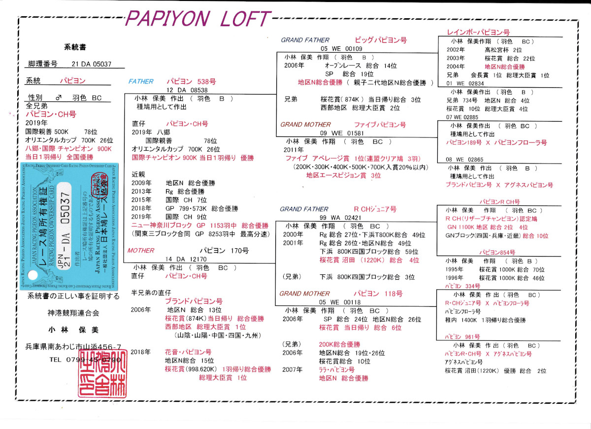 | ヨ出品鳩「21DA05037 BC♂」小林保美作 パピヨンCH号 19年ヤサト国際CH900K当日1羽帰り全国優勝鳩 の全兄弟鳩 | オークションNo: 1761452385 |