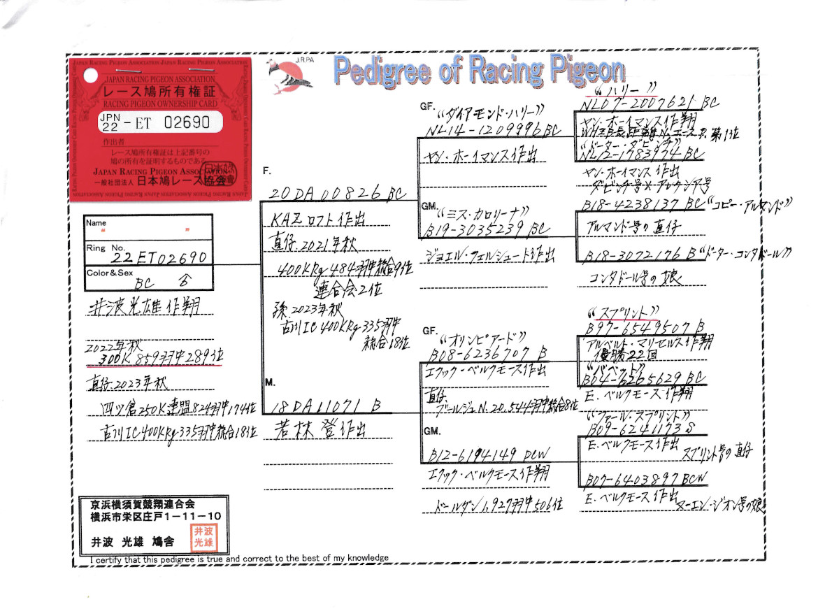 出品鳩「22ET02690 BC ♂」井波光雄鳩舎作翔 22年秋300k859羽289位鳩 直仔にも古川RG400K335羽総合18位鳩がいる KAZロフト作ハリー号孫鳩×若林作スプリント号孫鳩 との直仔です。 父親 「20DA00826 BC」KAZロフト作 直仔にRG400K484羽総合9位鳩がいる ホーイマン作ダイヤモンドハリー号(ハリー号×ドーターダビンチ号) ×ミス・カロリーナ号(アルマンド号直仔×コンタドール号娘) との直仔です。 母親 「18DA11071 B」若林 登鳩舎作 異母兄弟に ブールジュn20544羽総合8位鳩がいる ベルクモース作オリンビアード号(スプリント号直仔)×スプリント号孫鳩(ドールダン19+27羽506位)との直仔です。 詳しくは、血統書を参照してください。 <備考> 振込または、現金書留でお願いします。 菅原明鳩舎の概要はこちらをご覧ください |