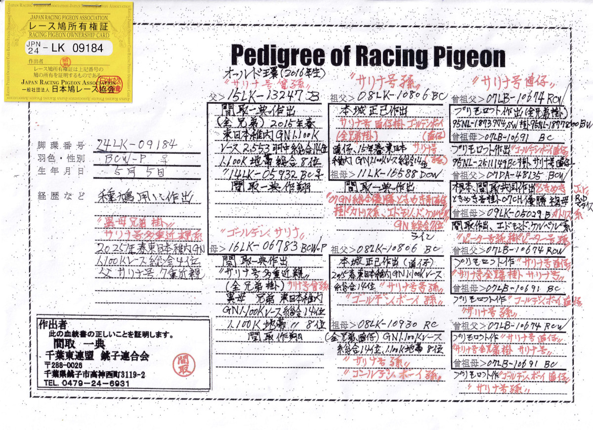 | 出品鳩「24LK09184 BCWP♀」間取一典作サリナ号多重近親 15年東日本GN1100K2553羽総合14位の全兄弟×15年東日本GN総合14位の異母兄弟鳩 | オークションNo: 1761452995 |