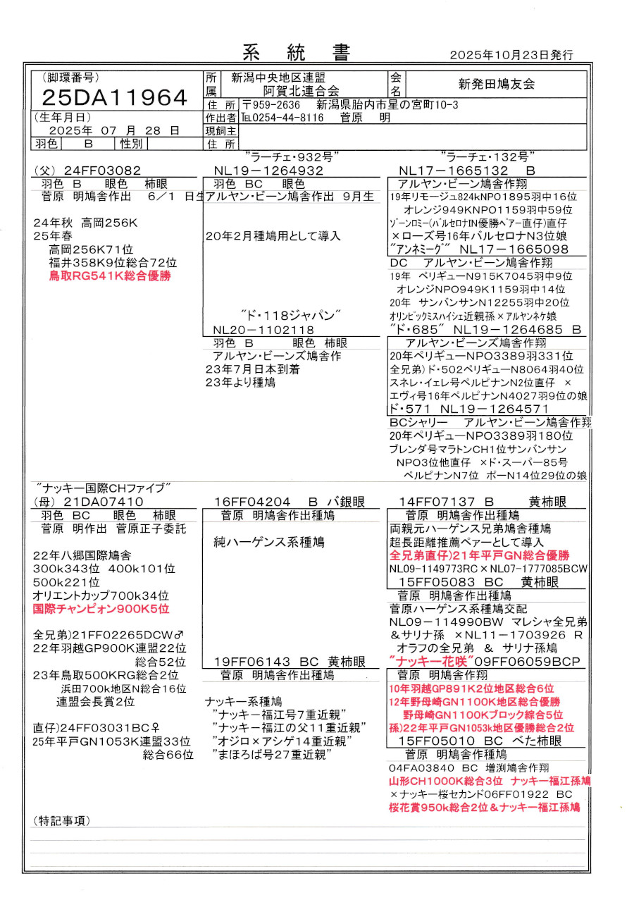 出品鳩「25DA11964 B」菅原 明鳩舎作 異父兄弟に25年平戸GN1053K総合66位鳩がいる 純Aビーンズ系鳥取RG541K総合優勝×ヤサト国際CH900K全国5位鳩 との直仔です。 父親 「24FF03082 B」菅原 明鳩舎作翔 25年春 鳥取RG541K総合優勝鳩で 両親A・ビーンズ鳩舎作 現在代表鳩アンネミーグ号ペリギューN9位オランジNPO14位サンバンサンS2−N7位直仔×(ド・685号ペリギューNPO3389羽331位×ド・571号ペリギューNPO3389羽180位)娘鳩 との直仔です。 母親”ナッキー国際CHファイブ”「21DA07410 BC」菅原 明作正子委託 22年八郷国際CH900K全国5位入賞鳩で 直仔も25年平戸GN1053K総合66位鳩がいる 純ハーゲンス系鳩 ×ナッキー花咲号野母崎GN1100K連盟優勝鳩の娘鳩 との直仔です。 詳しくは、添付の血統書を参照してください。 <備考> 現在管理人の鳩舎で元気に過ごしています。写真は10/24日に撮影しました。 菅原明鳩舎の概要はこちらをご覧ください |
