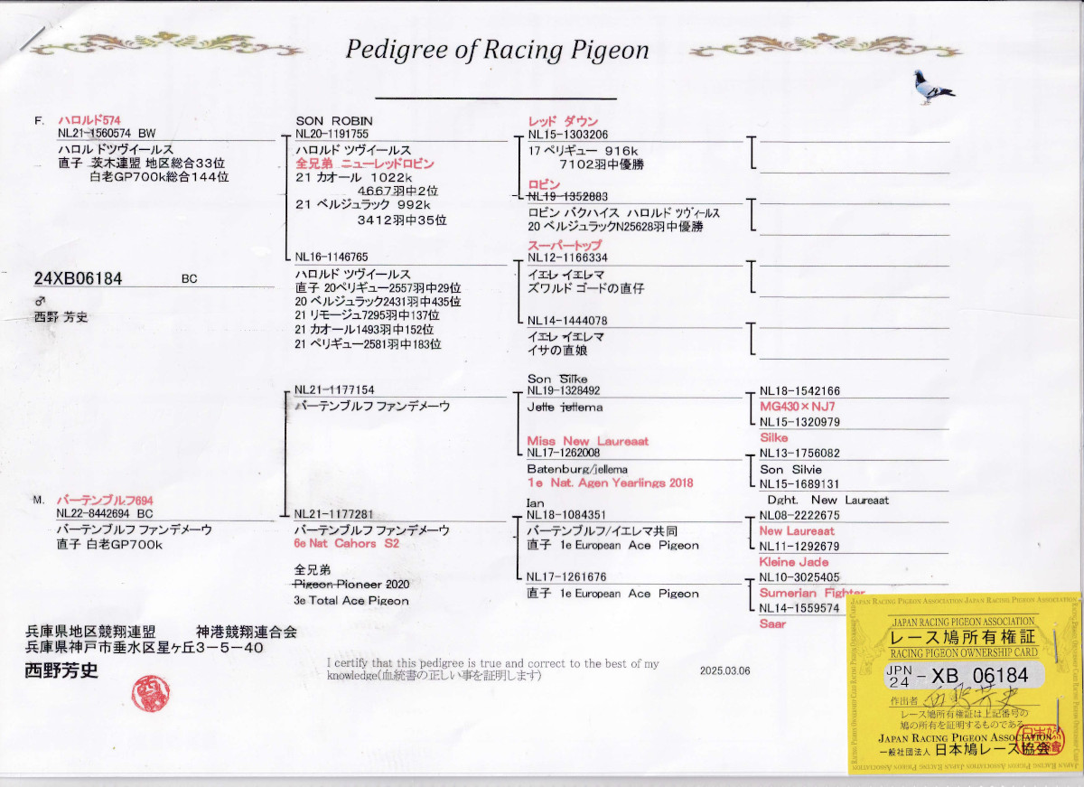 出品鳩「24XB06184 BC ♂」西野芳史鳩舎作半兄弟鳩に 茨城連盟地区N総合33位GP総合144位鳩がいるハロルド574号(ロビン号ベルジュラックIN総合優勝孫鳩)×バーテンブルグ694号(ニューロレアート号アジャンN一才優勝直仔×カオールS2N6位)娘鳩 との直仔です。 父親 "ハロルド574号"「NL21−1560574 BW」ハロルド・ツヴイールス鳩舎作 直仔に茨城連盟地区N総合33位GP総合144位鳩がいる ニューレッドロビン号カオールN2位ベルジユラックN35位の全兄弟(レッドダウン号ペリギュー7102羽優勝×ロビン号ベルジュラックIN総合優勝)直仔×スワルドゴード孫鳩 との直仔です。 母親 "バーテンブルグ694号"「NL22−8442694 BC」バーテンブルグ・ファンデメーウ鳩舎作 直仔にGP700K鳩がいる (シルケ号バルセロナN優勝直仔×ミス・ニロレアート号アジャンN一才優勝)直仔× カオールS2N6位&ヨーロッパAP1位鳩全兄弟鳩 との直仔です。 詳しくは、血統書を参照してください。 <備考> 現在管理人の鳩舎で元気に暮らしています。写真10/24日に撮影しました。 菅原明鳩舎の概要はこちらをご覧ください |