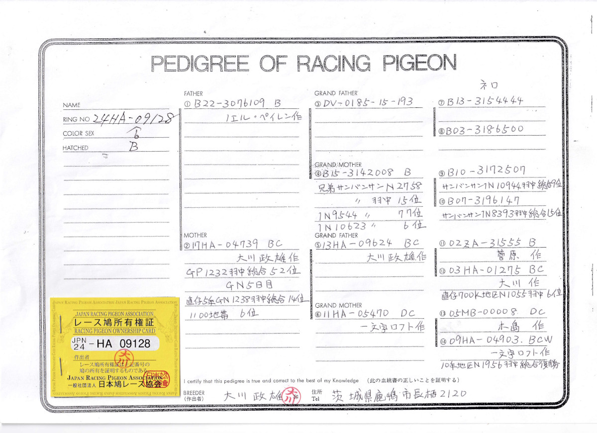 出品鳩「24HA09128 B ♂」大川政雄鳩舎作 R5年東日本GN1100K1238羽中総合14位鳩の異父兄弟鳩で Nペイレン作サンバンサンN9位15位孫×GP総合52位鳩 との直仔です。 父親 「B22−3076109 B」ノエル・ペイレン鳩舎作 ネロ号直仔× サンバンサンN15位兄弟(サンバンサンN109454羽総合9位×サンバンサンN8393羽総合15位)鳩 との直仔です。 母親 「17HA04739 BC」大川政雄鳩舎作翔 GP1232羽総合52位GN5日目 直仔にR5年東日本GN1100K1238羽中総合14位入賞鳩がいるで 地区N総合6位異父兄弟×一文字作地区N1956羽総合優勝の娘鳩 との直仔です。 詳しくは、血統書を参照してください。 <備考> 現在管理人の鳩舎で元気に暮らしています。写真10/24日に撮影しました。 菅原明鳩舎の概要はこちらをご覧ください |