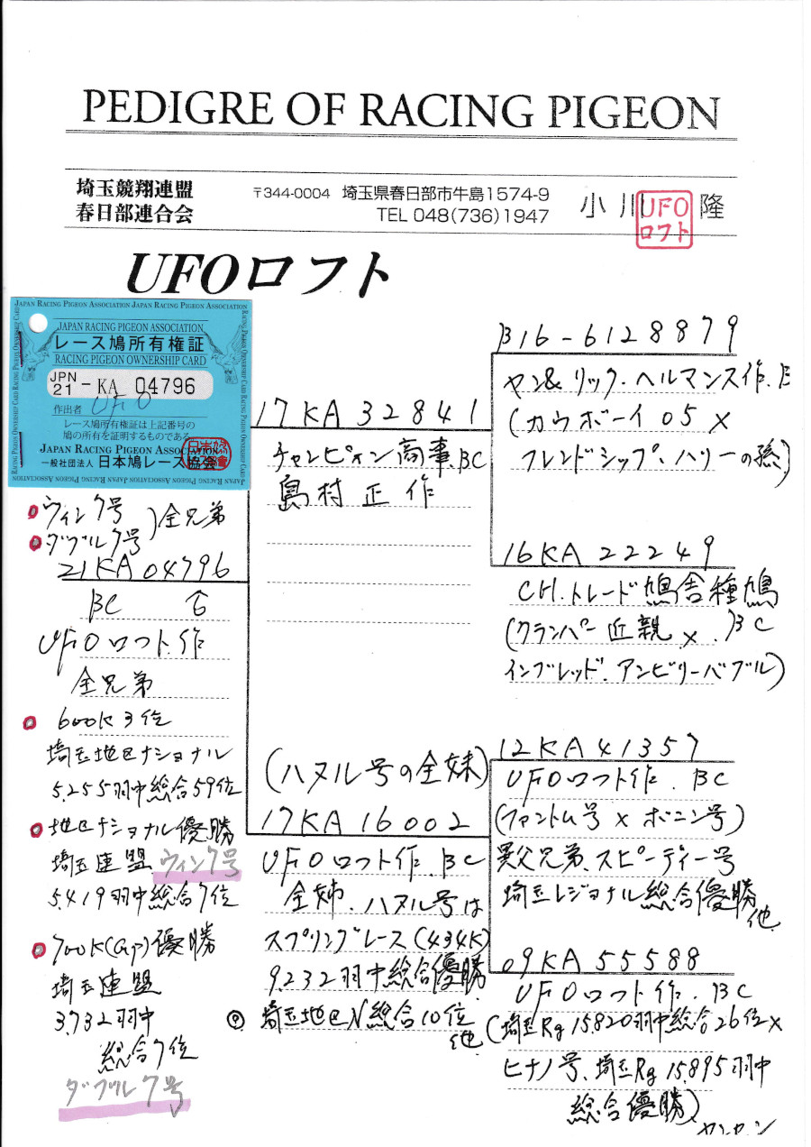 | 出品鳩「21KA04796 BC♂」UFOL作 ウイック号埼玉地区N5419羽総合7位鳩ダブル7号埼玉GP700K3732羽総合7位鳩全兄弟鳩 | オークションNo: 1761454745 |