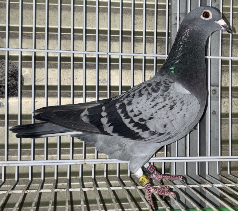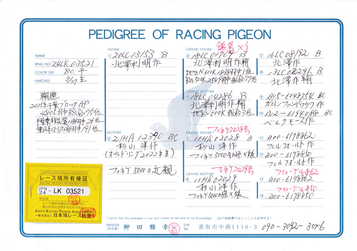 出品鳩「24LK03521 BC ♀」柳田雅幸鳩舎作翔 25年千葉ブロックGP4805羽総合175位千葉東桜花賞1181羽総合26位東日本CH7081羽総合191位鳩で 北澤作錦亀メイ号地区N600K総合優勝直仔×杉山作フィネケ5000号近親鳩 との直仔です。 父親 「20LC13153 B ♂」北澤利明鳩舎作柳田雅幸鳩舎種鳩 直仔)300k3897羽総合12位RG400k3100羽総合12位GP800K3435羽総合81位1000K1181羽総合26位55位838羽総合94位鳩がいる 錦亀メイ号地区N600k1838羽総合優勝鳩×地区N600K総合3位鳩 との直仔です。 母親 22年生「21HA12390 BC」杉山 洋鳩舎作 フィネケ5000号近親鳩 フィネケ2028号(フィネケ5000号孫×娘)×フィネケ2029号(フィネケ5000号孫×娘)との直仔です。 詳しくは、血統書を参照してください。 <備考> 現在管理人の鳩舎で元気に暮らしています。写真11/1日に撮影しました。 菅原明鳩舎の概要はこちらをご覧ください |