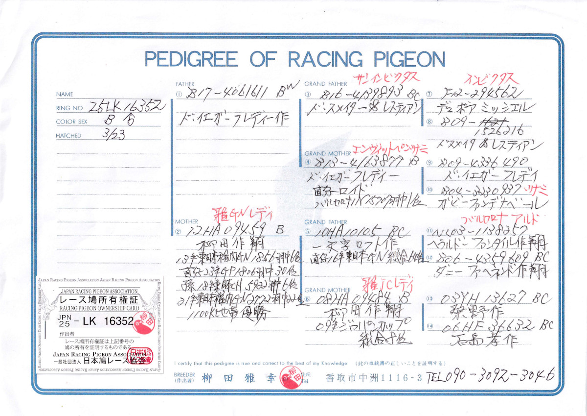 出品鳩「25LK16352 B」柳田雅幸作ドイエガーフレディー作ロイド号バルセロナIN総合優勝の異父兄弟×雅GNレディ号東日本GN1856羽総合6位 ![]() |