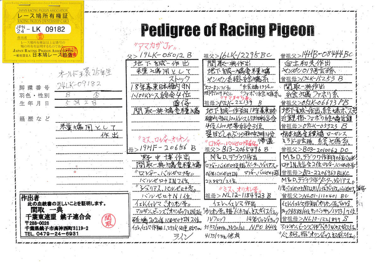 出品鳩25年生「24LK09182 B」間取一典鳩舎作 アマカザリ号絵鳩系18年東日本GN1100K1781羽中総合4位直仔×野中作(ロジャーバルセロナ直仔×イエレマ作オリオン号娘)娘鳩 との直仔です 父親 "アマカザJr号"「19LK05012 B」地下誠一鳩舎作 アマカザリ号絵鳩系18年東日本GN1100K1781羽中総合4位鳩×(ヤンセン系×絵鳩系)直仔 との交配との直仔です。 母親 "ミス・ロジャー・オリオン号"「19HF20656 B」野中 博鳩舎作 デブクワ作 ロジャーバルセロナ号バルセロナN優勝IN2位の直仔 × イエレマ作 ミス・オリオン号(オリオン号×ド・ホテル号)との直仔です。 詳しくは、添付の血統書を参照してください。 <備考> 現在管理人の鳩舎で元気に暮らしています。写真11/1日に撮影しました。 菅原明鳩舎の概要はこちらをご覧ください |