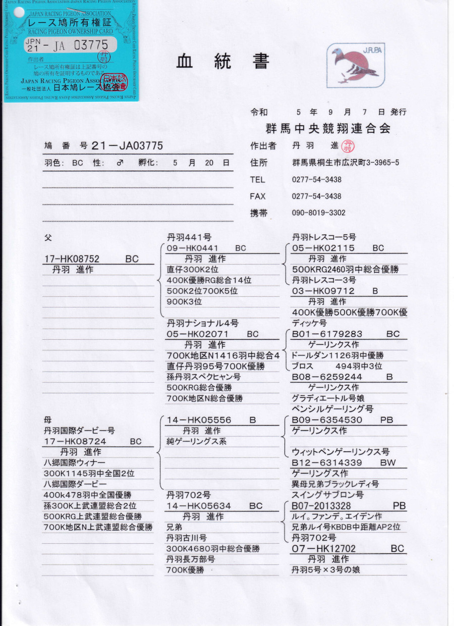 出品鳩「21JA03775 BC ♂」丹羽 進鳩舎作 ゲーリンクス系丹羽ナショナル4号地区N700K総合4位直仔×丹羽国際ダービー号18年ヤサト国際ウィナー300k1145羽全国2位 国際ダービー400k478羽全国優勝鳩 との直仔です。 父親 「17hk08752 BC」丹羽 進鳩舎作 半兄弟鳩に RG400k優勝総合14位5400K2位700k優勝5位900K3位鳩がいる 丹羽441号(丹羽トレスコ5号RG500K総合優勝×丹羽トレスコ3号400K500K700K各優勝)×丹羽ナショナル4号地区N7400K1416羽総合5位(両親ケーリンクス作)鳩 との直仔です。 母親 "丹羽国際ダービー号"「17HK08724 BC」丹羽 進鳩舎作委託 18年ヤサト国際ウィナー300k1145羽全国2位 国際ダービー400k478羽全国優勝鳩 孫鳩もRG500k地区N700K各総合優勝がいる 両親ゲーリンクス作鳩 ×丹羽702号(兄弟 丹羽古川号300k4680羽総合優勝)との直仔です。 詳しくは、添付の血統書を参照してください。 <備考> 現在管理人の鳩舎で元気に暮らしています。写真11/1日に撮影しました。 菅原明鳩舎の概要はこちらをご覧ください |
