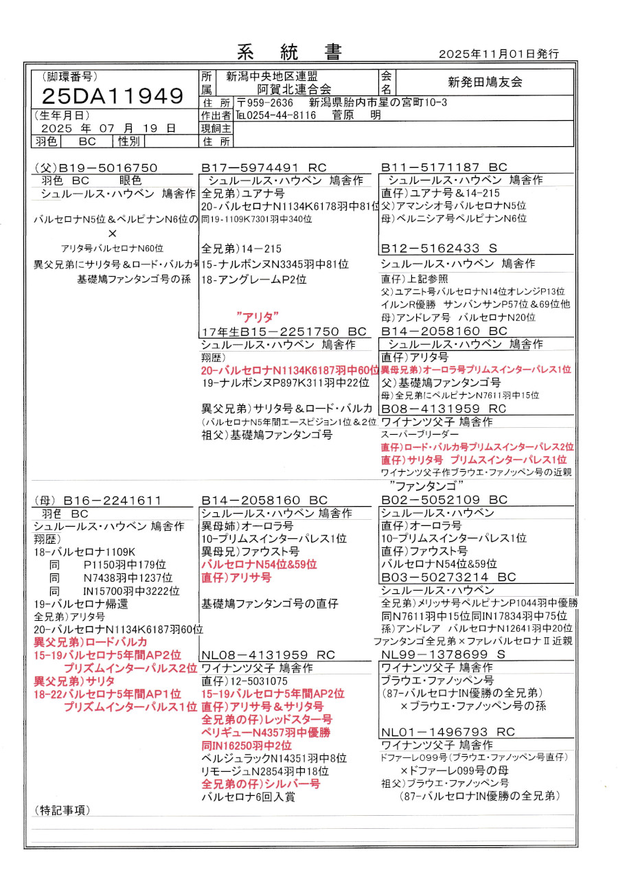 出品鳩 「25DA11949 BC」菅原 明作両親S・ハウベン作アリタ号バルセロナN6187羽総合60位直仔×バルセロナN7438羽1237位(全兄弟アリタ号) ![]() |