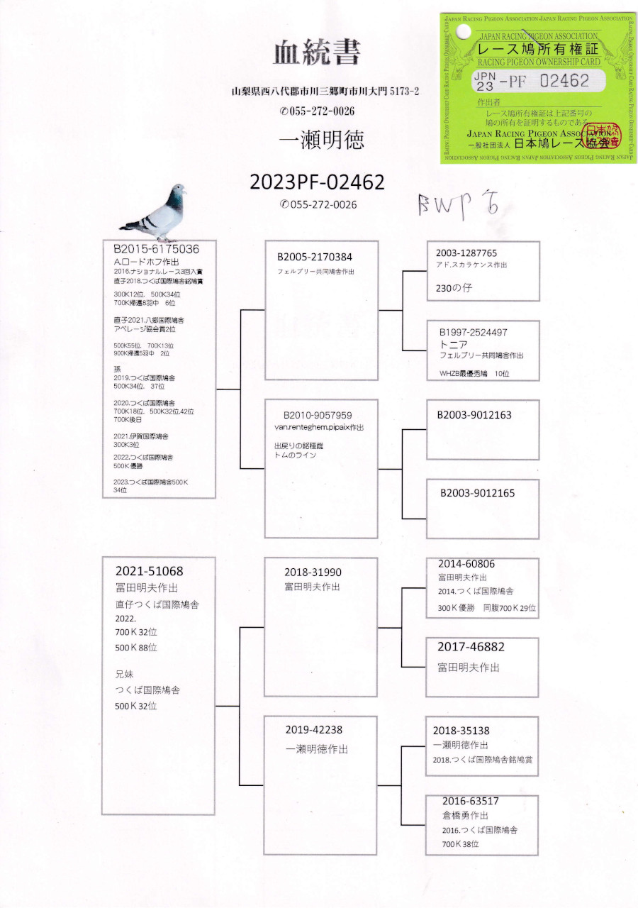 出品鳩「23PF02462 BWP♂」一瀬作半兄弟)つくば700k6位八郷CH900k2位協会賞2位 ロードホフ作(トム号ライン)×富田作18年つくば銘鳩賞の孫 ![]() |