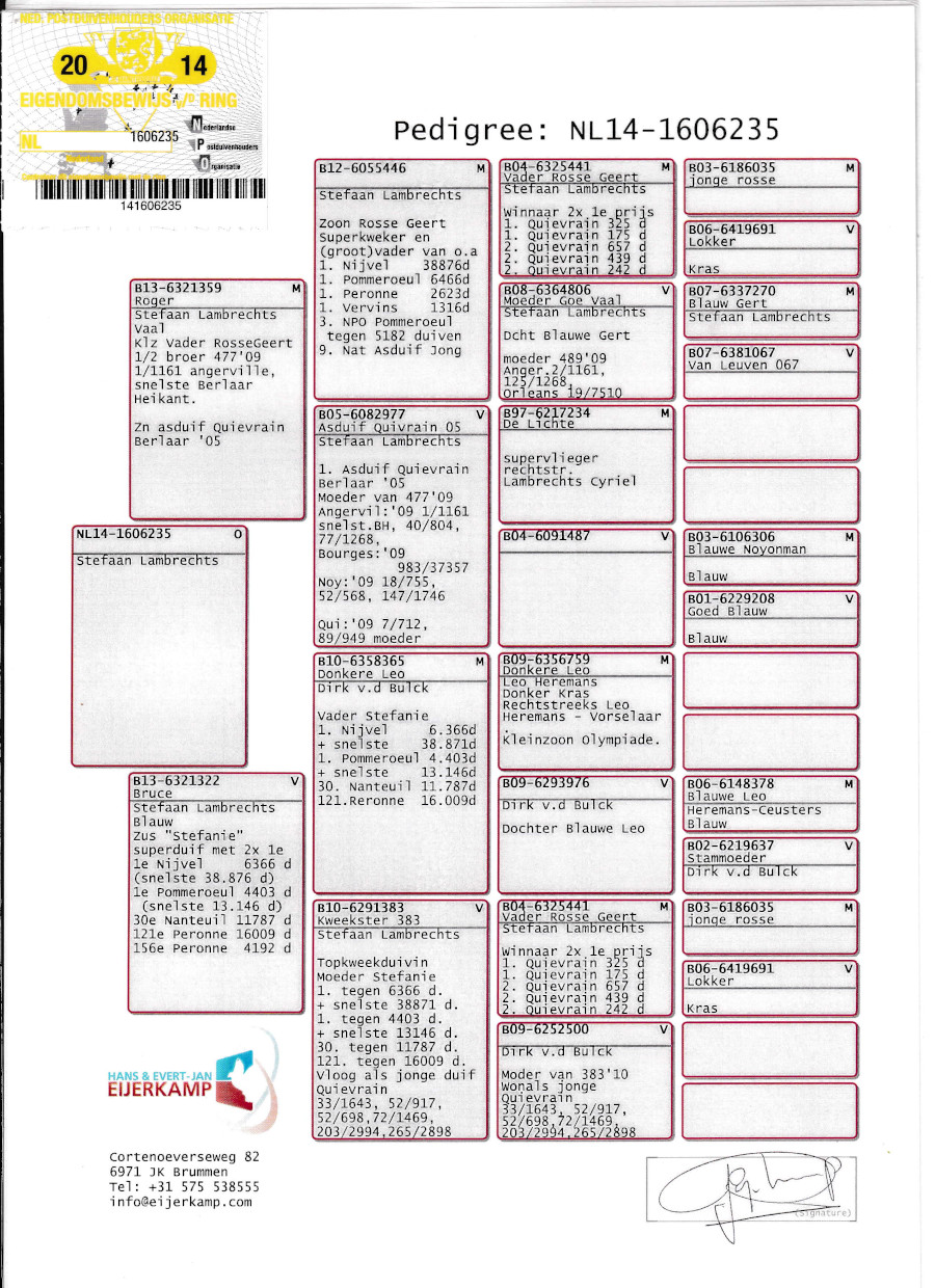 出品鳩「NL14−1606235 B♂」アイーヤーカンプ作ナイヴェル38876羽他6466羽2623羽各優勝半兄弟×ナイヴェル6366羽ホムロウル4403羽各優勝全兄弟 ![]() |