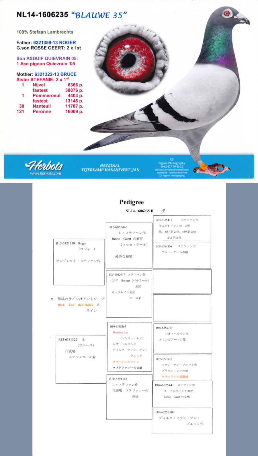 出品鳩NL14−1606235 B ♂」アイヤーカンプ鳩舎作ランブレヒト・ステファン系ナイヴェル38876羽優勝ホムロウル6466羽優勝ペロンヌ2623羽優勝ヴェルヴィンズ1316羽優勝アンガービル1161羽優勝の半兄弟×ステファニー号ナイヴェル6366羽優勝ホムロウル4403羽優勝の全兄弟鳩 との直仔です。 父親 ”ロジャー号”「B13−6321359」ランブレヒト・ステファン鳩舎作 半兄弟にナイヴェル38876羽優勝ホムロウル6466羽優勝ペロンヌ2623羽優勝ヴェルヴィンズ1316羽優勝アンガービル1161羽優勝鳩がいる スーパー種鳩(ロッセゲール号優勝2回2位3回の直仔)×05年地区エ−スP鳩 との直仔です。 母親 「B13−6351322 B」ランブレヒト・ステファン鳩舎作 全兄弟鳩に ステファニー号ナイヴェル6366羽優勝ホムロウル4403羽優勝鳩がいる ディルク・ファンデンブルク作(レオヘルマン作オリンピァードの孫×キッテルの基礎鳩 ブラウエ・レオ号の娘鳩 との直仔です。 詳しくは、血統書を参照してください。 ※当該鳩は高齢鳩で今年の作出は出来ましたが来年の保証は出来かねますのでご理解の上ご参加をお願いいたします。 <備考> 振込または、現金書留でお願いします。 菅原明鳩舎の概要はこちらをご覧ください |