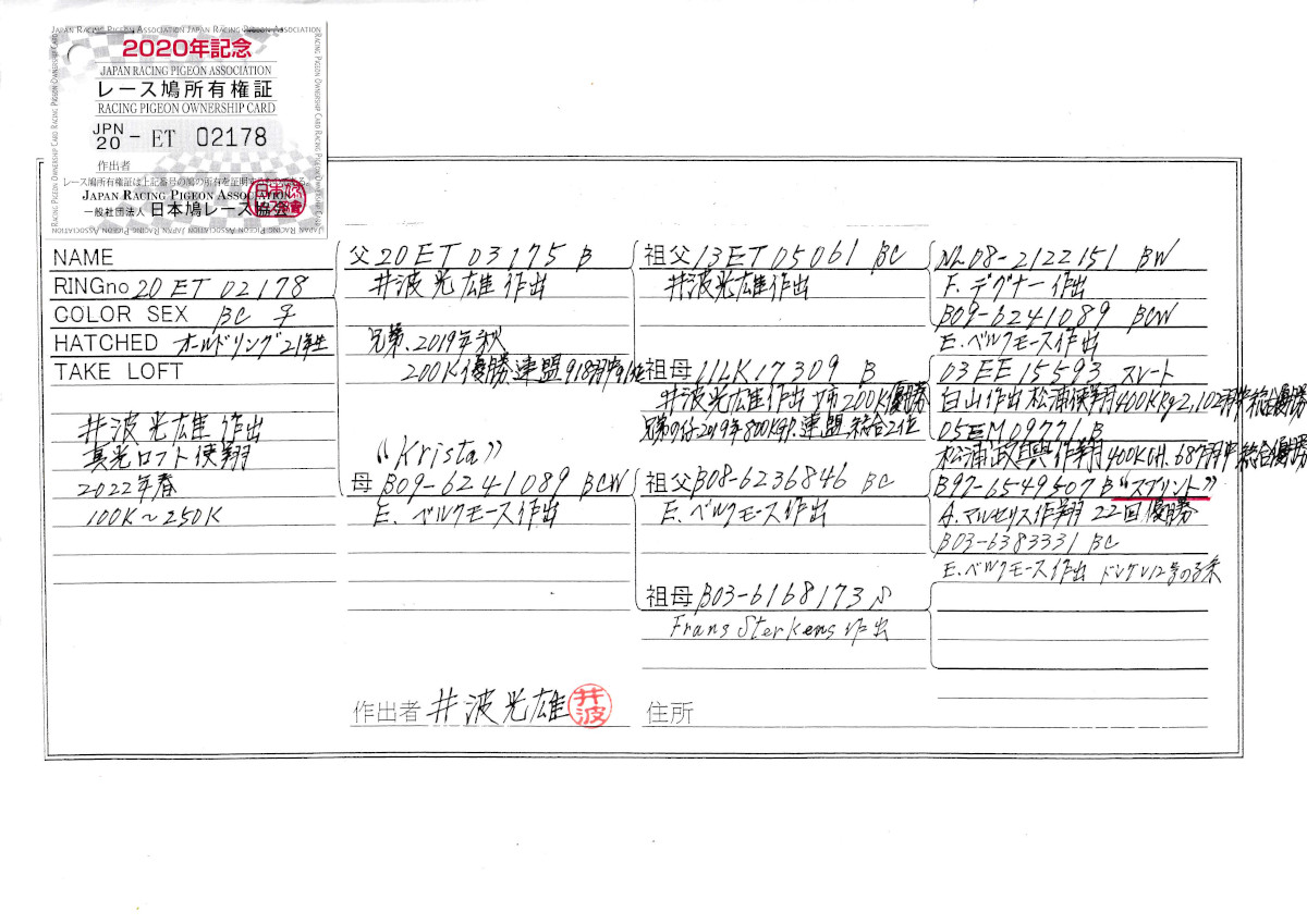 出品鳩21年生「20ET02178 BC ♀」井波光雄鳩舎作 (白山作翔RG400K2102羽総合優勝×松浦作翔400KCH687羽総合優勝)孫鳩 ×E・ベルクモース作 銘鳩スプリント号の孫鳩 との直仔です。 父親 「20ET03175 B」井波光雄鳩舎作 兄弟に200k優勝918羽総合91位鳩がいる (デグナー作鳩×ベルクモース作鳩)直仔×(白山作翔RG400K2102羽総合優勝×松浦作翔400KCH687羽総合優勝)娘鳩 との直仔です。 母親 ”Krista号”「B09−6241089 BCW」E・ベルクモース鳩舎作 銘鳩スプリント号の孫鳩です。 詳しくは、血統書を参照してください。 <備考> 振込または、現金書留でお願いします。 菅原明鳩舎の概要はこちらをご覧ください |