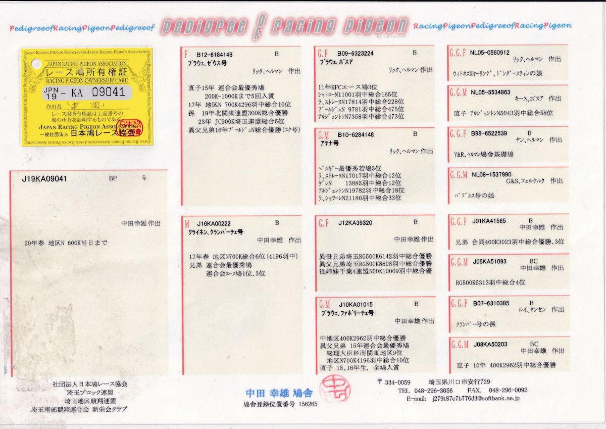 | 出品鳩「19KA09041 BP♀」中田幸雄作リック・ヘルマン作アテナ号ベルギー最優秀若鳩3位直仔×17年地区N700K4196羽中総合6位 | オークションNo: 1762647265 |