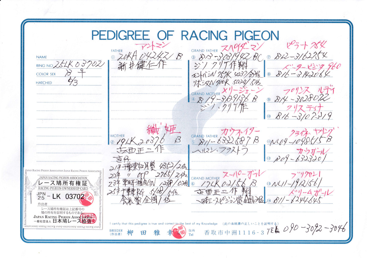 | 出品鳩「25LK03702 B」柳田雅幸作異父兄弟)25年日本AP賞1位 ジノクリケ作スパイダーマン号リボンヌN5位直仔×織姫号(スーパーガール号日本AP2位娘) | オークションNo: 1762647448 |