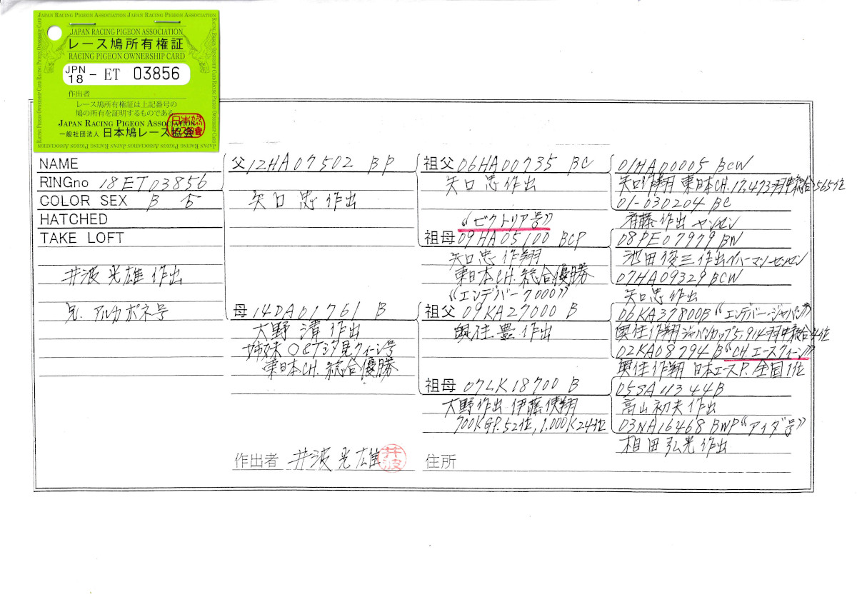 | 出品鳩「18ET03856 B♂」井波作全兄弟)アルカポネ号ブロック400K総合優勝 ビクトリア号東CH総合優勝直仔×汐見クィーン号東CH総合優勝全姉妹 | オークションNo: 1762647802 |