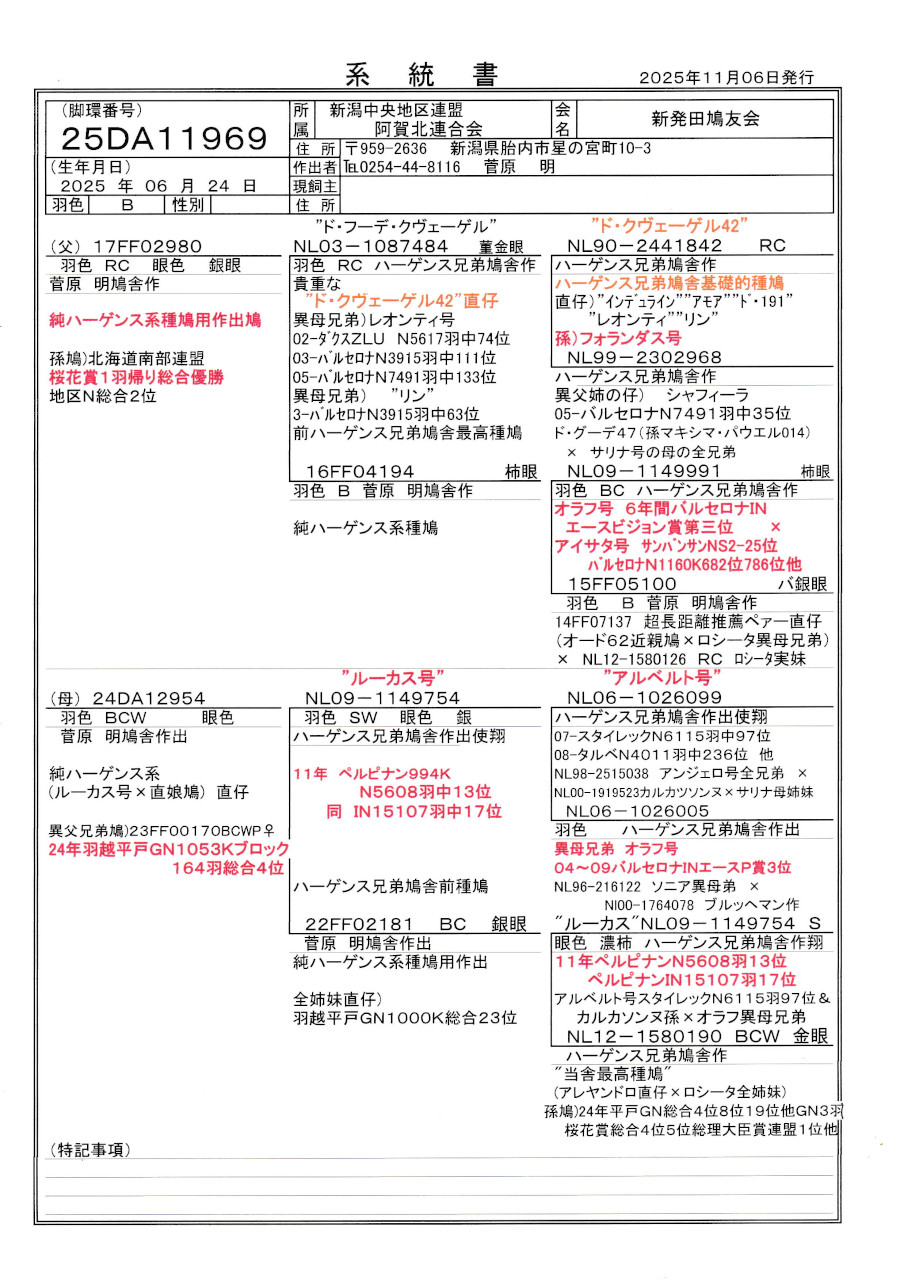 出品鳩「25DA11969 B」菅原 明鳩舎作 純ハーゲンス兄弟系サリナと並ぶ二代種鳩ド・クヴェーゲル42号孫×ルーカス号(ペルピナンIN15107羽総合17位)親娘交配の娘鳩 との直仔です。 父親「17FF02980 RC」菅原 明鳩舎作 純ハーゲンス兄弟系 孫鳩に 桜花賞1羽帰り総合優勝 地区N総合2位鳩がいる サリナと並ぶ二代種鳩ド・クヴェーゲル42号直仔×オラフ号6年間バルセロナINエースP3位の孫鳩 との直仔です。 母親「24DA12954 BCW」菅原 明鳩舎作 純ハーゲンス兄弟系 異父兄弟に 24年羽越平戸GN1053K総合4位鳩がいる ルーカス号ペルピナンIN15107羽総合17位鳩 ×ルーカス号の娘鳩 との親娘 種鳩交配の直仔です。 詳しくは、添付の血統書を参照してください。 <備考> 現在管理人の鳩舎で元気に暮らしています。写真11/7日に撮影しました。 菅原明鳩舎の概要はこちらをご覧ください |